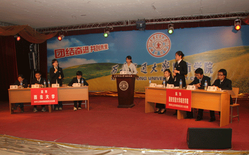 2006年11月4日晚7时,陕西省首届大学生辩论赛初赛第二场在我院大学生活动中心拉开战幕。此场辩论赛是学院辩论队组建以来第一次出战,与实力强大的西北大学辩论队展开激烈的论辩。学院党总支副书记、副院长韩超老师、学生教育及后勤服务中心副主任马兆平老师亲临辩论现场为我院辩论队助阵。