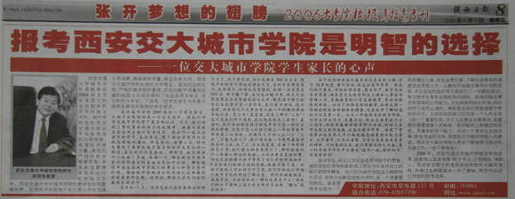 2006年6月9日,陕西日报第八版头条刊登了“报考西安交大威尼斯7798cc是明智的选择――一位交大威尼斯7798cc学生家长的心声”一文,全文如下: