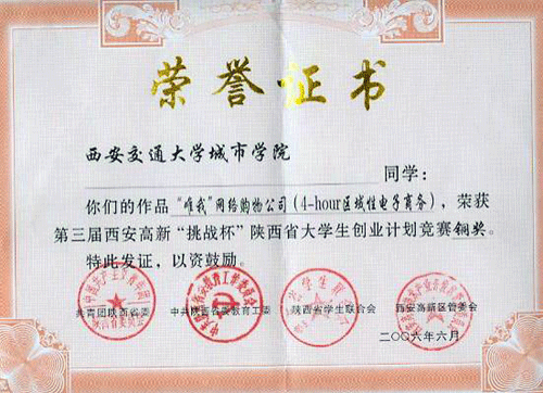 前不久,第三届西安高新“挑战杯”陕西省大学生创业计划竞赛在高新区管委会落下帷幕。在此次竞赛中,我院经管406班王顺冉、经管403班张兆鹏、经管403班马瑞、经管413班李茜、经管408班许瑶、经管407班李晓刚、经管403班刘通、经管403班刘宇、经管403班吴嘉润、经管403班谢昕等10名同学组成的4―hour创业团队创作的《“唯我”网络购物公司(4―hour区域性电子商务)》创业计划书,经过知名专家学者、风险投资家组成的评审委员会的书面评审和秘密答辩,最终获得铜奖。