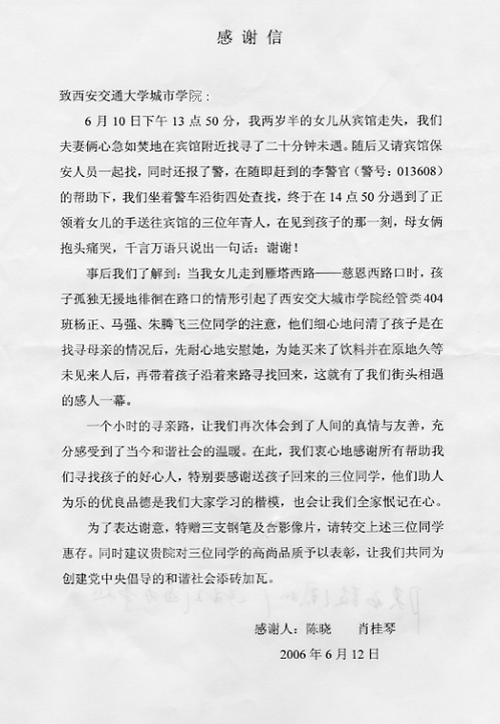 6月10日,我院经管404班杨正、马强、朱腾飞同学主动帮助与父母走失小孩找到了亲人,他们助人为乐的高尚品德受到小孩父母的高度赞扬。下面是孩子父母写给学院的感谢信:
