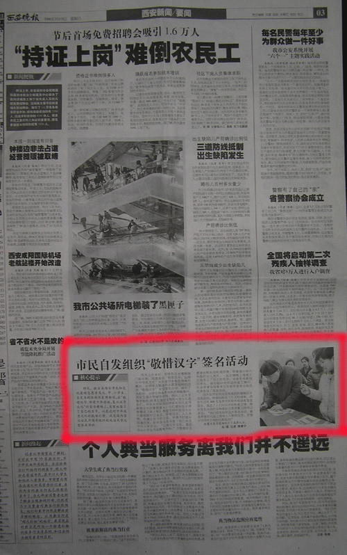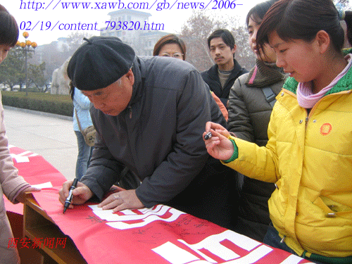 2月18日上午9时,在陕西历史博物馆门前东侧,举行了由西安文化爱好志愿者组织的“敬惜汉字,弘扬中华传统文化”大型签名活动。西安市各电视台、报纸等媒体关注了此次活动。
