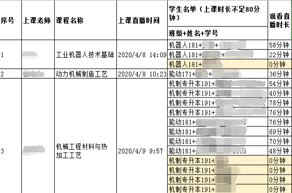 1.机械系高度重视线上教学质量把控规范化管理,为此由机械系主任刘吉轩教授亲自组织本单位教职工召开会议,研究制定了《机械工程系在线教学规范化管理要求》,该规定主要从教师的教学准备、教学过程、在线教学过程考核、督教督学以及学生在线学习五个方面做了标准化要求,并已经从本周开始实施。机械系的线上授课教师、教务管理人员、系级督导老师、辅导员、班主任和学生干部齐抓共管,协同联动,在一周结束后统计跟进每门课程的学生的“到课率”、“完课率”(观看直播/回放时长超过80分钟)、“观看视频回放学生”、“上课时长不足80分钟学生名单”等数据,实现了组织严密的精细化管理,对线上教学质量进行全面的把控。机械系开设的课程本周平均完课率达到90.11%。