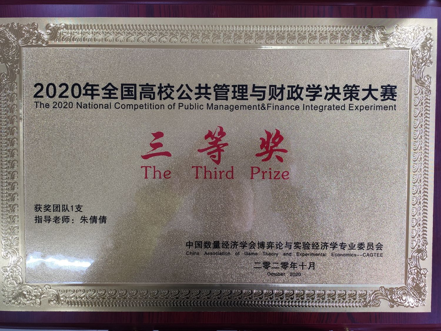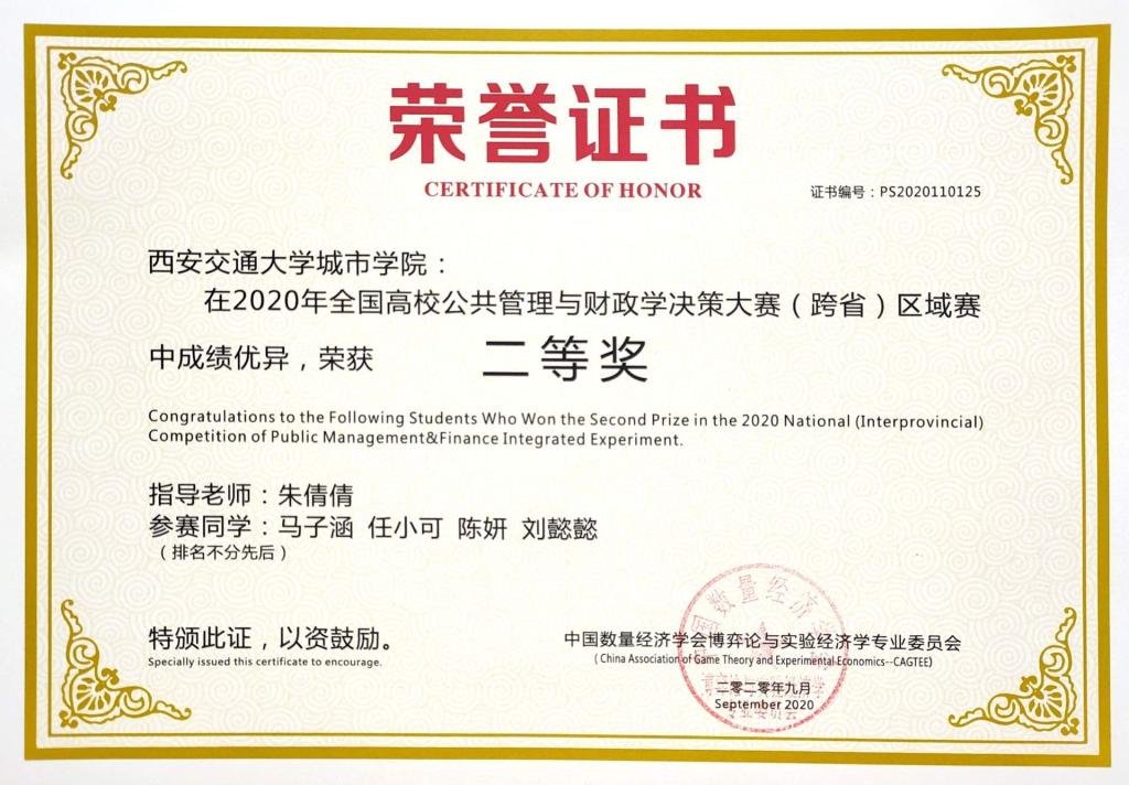 近日,由中国数量经济学会主办、安徽财经大学承办的2020年(首届)全国高校公共管理与财政学决策博弈大赛圆满落幕。威尼斯7798cc代表队在经济系财政专业朱倩倩老师带领下,经过五个多月的刻苦练习,在本次比赛中荣获全国三等奖。