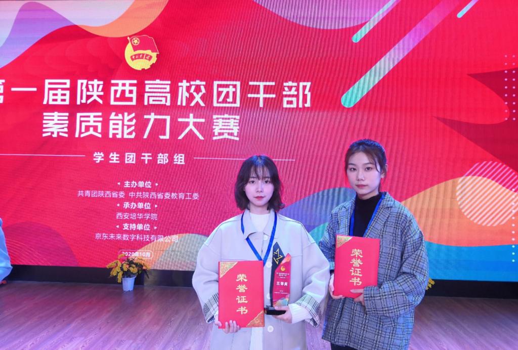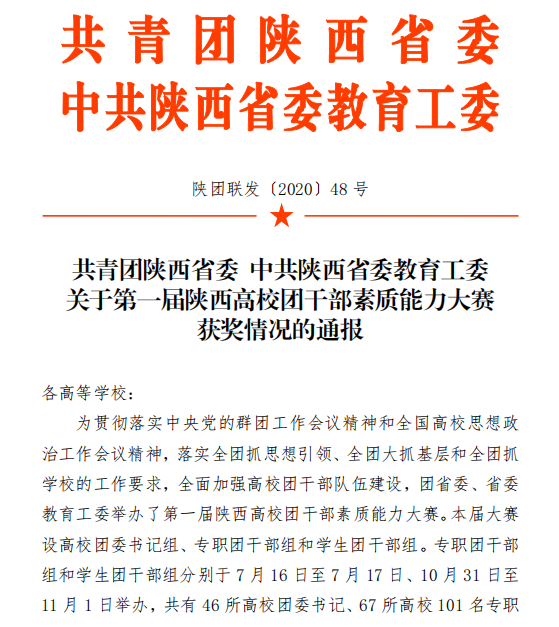 日前,共青团陕西省委、中共陕西省委教育工委联合发表了关于“第一届陕西高校团干部素质能力大赛”获奖情况。在此次活动中,我院获得喜人的成绩,团委书记吴昊翔荣获高校团委书记组优秀奖,团委茹静荣获专职团干部组优秀奖;魏婷婷同学荣获学生团干部组三等奖,陈佳旭同学荣获学生团干部组优秀奖。