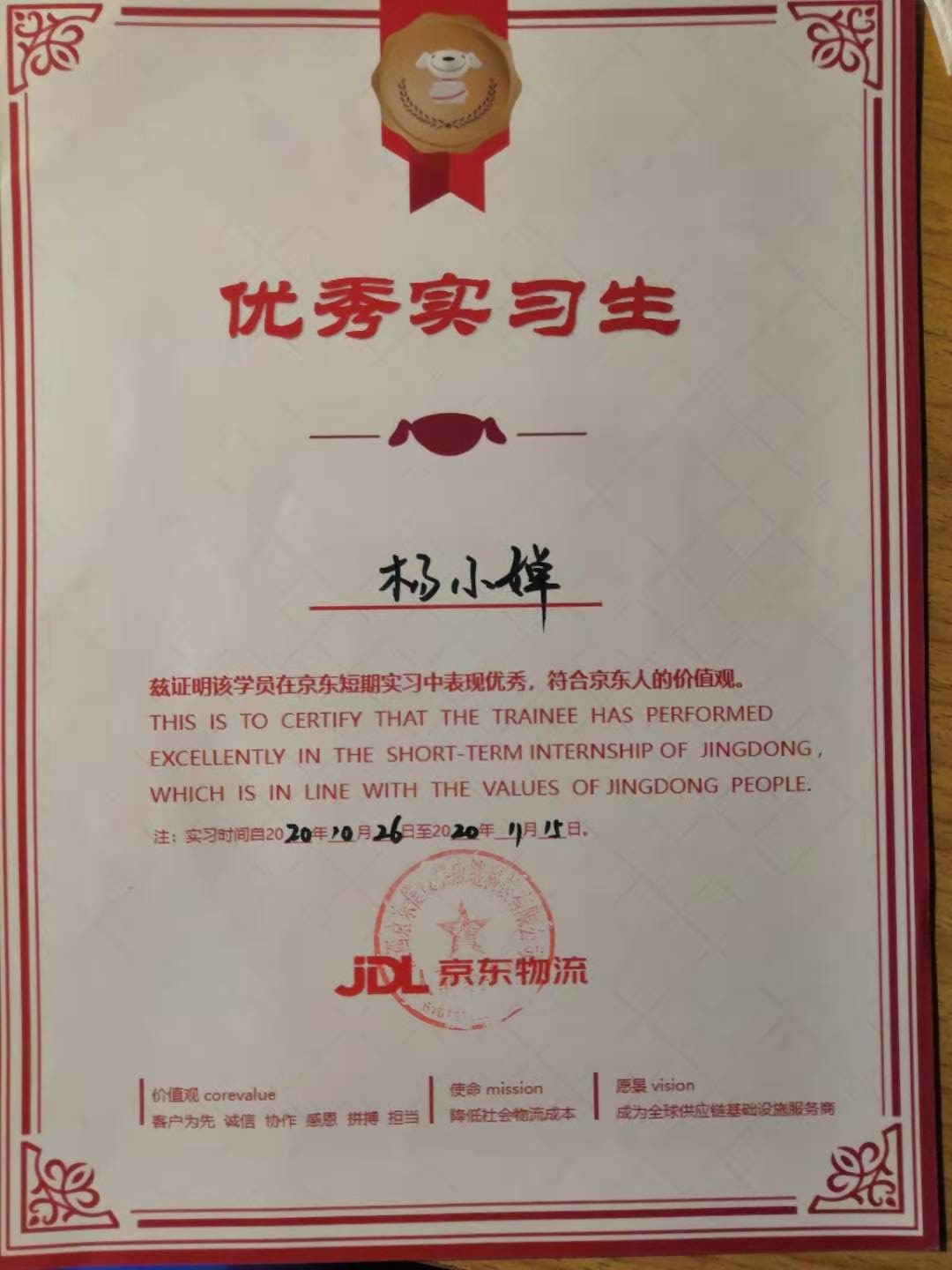 在本次集中实习中,威尼斯官网学生有拼劲、有想法,认真学习、克服苦难,充分展现了威尼斯官网学生的素质与能力,获得了京东西北区管理者的一致好评,在京东西北区双十一大促合作的17所院校中获得综合评价第一的优异成绩。其中,张文静、惠琛等4名同学获得京东西北区“绿色就业通道”证书,胡发彩、邱苑玲等11名同学获得“优秀实习生”称号,所有参与实习的同学均获得京东西北区“新锐之星”管培生最终面试资格,并在终极面试中,有10名同学拿到京东西北区“新锐之星”管培生的offer。
