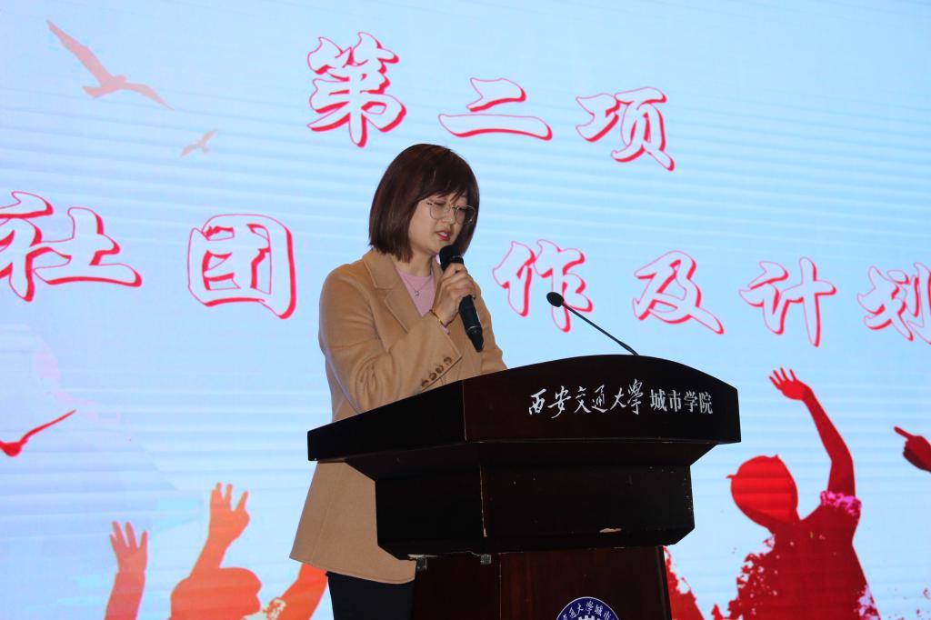 会议伊始,全体起立,奏唱团歌。随后,学院团委书记茹静老师对社团工作进行总结与计划。她指出,2020年度学院社团在全院师生的共同努力下取得了阶段性成果,不论从社团活动开展次数、活动时长、参与人数以及四、五星级社团数量方面较上一年度均有明显提升。2021年在此基础上,学院团委将继续以学院及学生服务中心重点工作为主要发力点,做好学院社团工作的顶层设计及服务保障工作,持续以制度建设为基础,品牌活动为载体、专业水准为指导,着力打造具有底色、亮色和成色的城院品牌社团活动新名片。