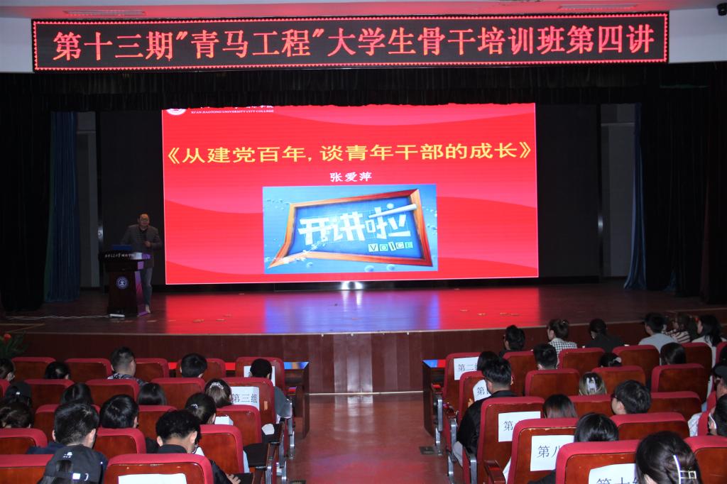 为进一步加强学生干部的理论素养,提升学生干部的工作能力和思想觉悟,学院团委3月29日于教二报告厅举办了第十三期“青马工程”大学生骨干培训班第四讲:党史百年——从总书记中青班的谈话谈青年干部的修炼成长。本次讲座由学院党委书记张爱萍主讲,学院团委书记茹静,团委指导老师丁义伟、金牧羊,各系团工委书记,院、系及各学生社团代表们和十三期“青马工程”学员参加了本次讲座。