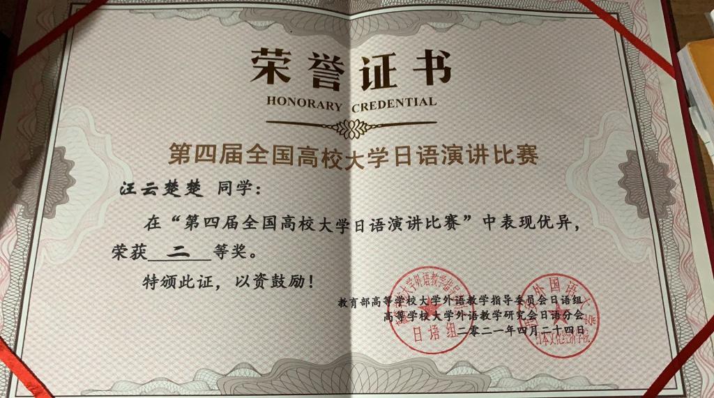 西安交大威尼斯7798cc外语系商英181班汪云楚楚同学于4月24日参加第四届全国大学生日语演讲比赛决赛并获得二等奖。