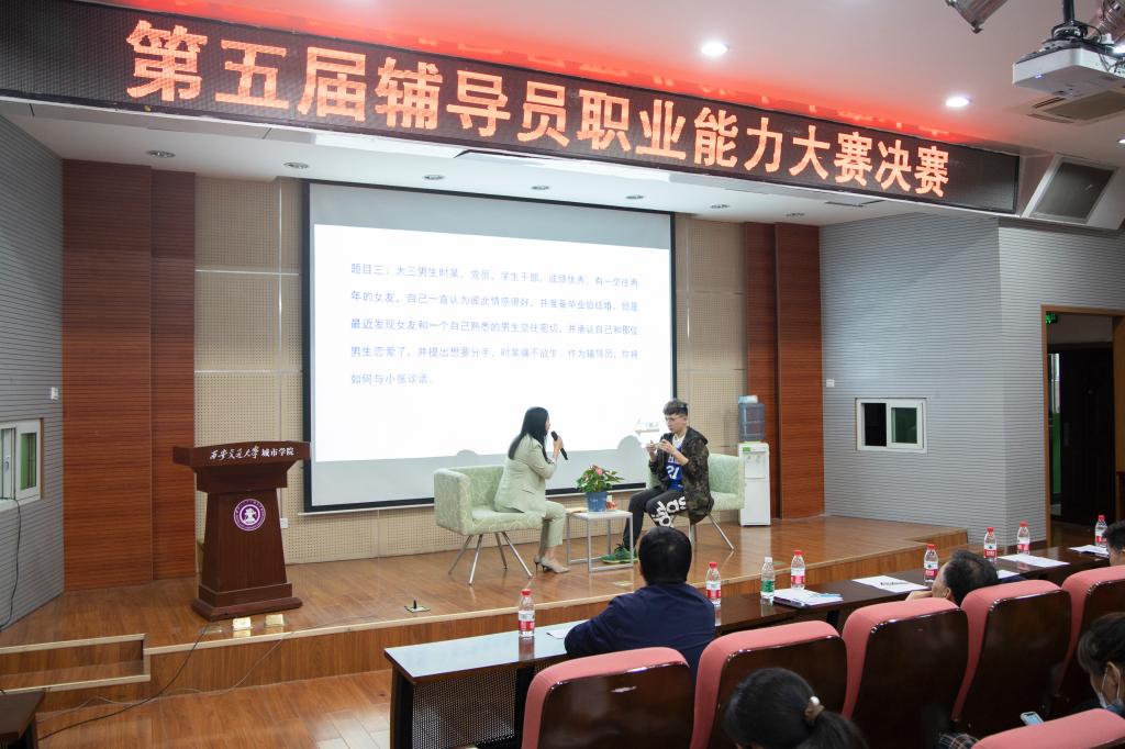 本次决赛内容为谈心谈话,旨在以情景再现的方式考察辅导员在日常工作中的综合技能。助演学生模拟了学生工作常见的就业创业、心理健康、学生资助,宿舍人际等方面的问题,选手们在各种问题面前,临危不乱,冷静分析、积极沟通。整场比赛紧张激烈、精彩不断,助演们丰富的表现力也为比赛现场增色不少。