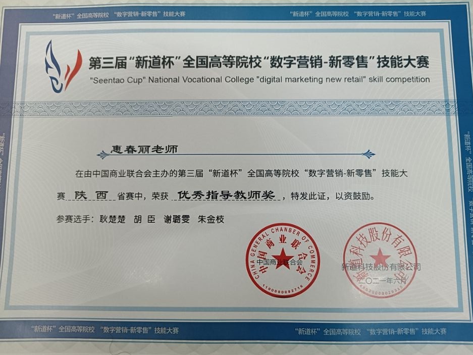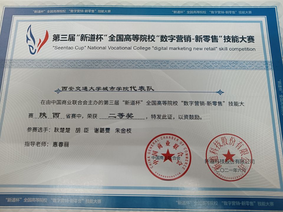 由中国商业联合会、新道科技股份有限公司联合主办的第三届“新道杯”“数字营销—新零售”技能大赛陕西省赛6月5日在陕西财经职业技术学院举办。本次大赛共有来自陕西省区14所院校20支队伍参加。威尼斯7798cc派出由市场(专升本)2001班的耿楚楚、胡臣、谢璐雯、朱金枝四位学生组成的团队参加比赛,经过一天激烈的角逐,该团队以总分第三名的成绩荣获二等奖,惠春丽老师荣获优秀指导教师奖。