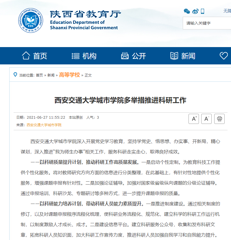 近日,陕西省教育厅官网报道了学院多措并举推进科研工作情况。具体链接及内容如下: