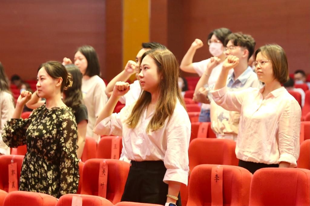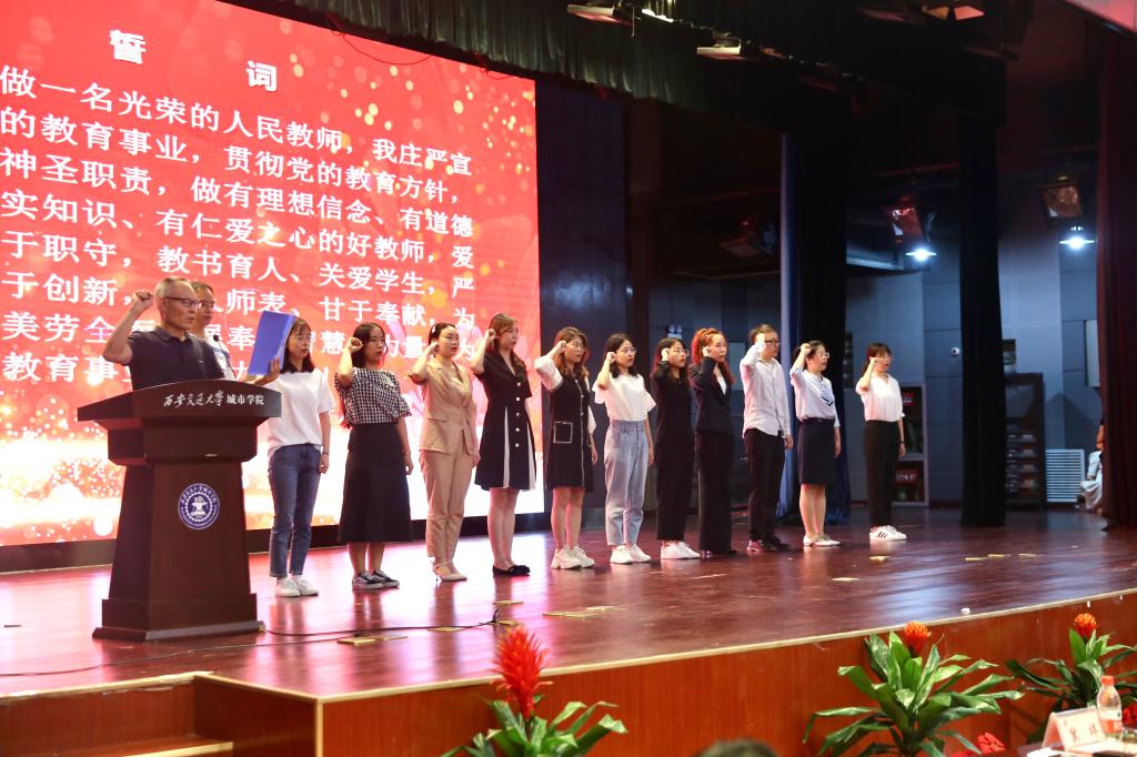 学生代表传播系陈倬同学在发言中对各位老师致以节日的问候,感恩老师的关怀和指导。随后,由教授会主席王海民教授领誓,全体新入职教师起立并右手握拳宣誓,做出庄严的师德承诺。