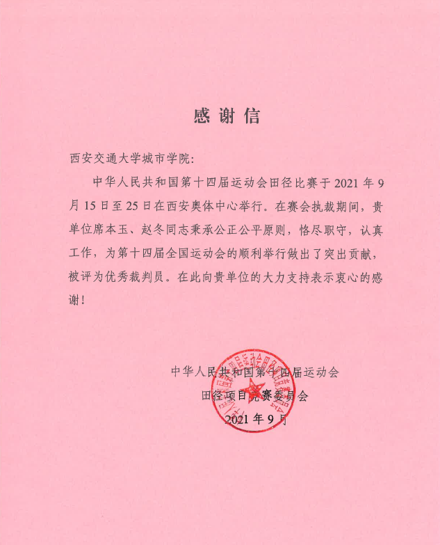 近日,西安交大威尼斯7798cc收到第十四届全国运动会田径项目竞赛委员会发来的感谢信。赛委会在信中对我院席本玉、赵冬两位同志在田径项目赛会执裁期间的工作给与了高度肯定,对学院大力配合赛会工作表示衷心的感谢。据悉,席本玉、赵冬两位同志秉承公正公平原则,恪尽职守、认真工作,在十四届运动会中被评为优秀裁判员。