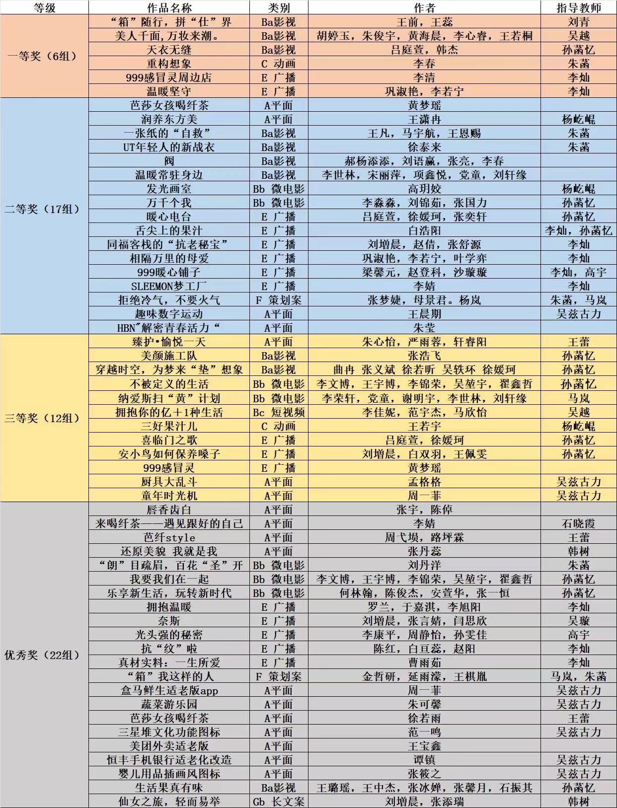传播系45组获奖作品中,一等奖6组,二等奖15组,三等奖10组,优秀奖14组。在今年一等奖获奖作品中,影视广告类、广播类、动画类获奖数量较去年均有所提升,尤其是动画类作品实现了一等奖零的突破。二等奖获奖作品数量比去年提升了47%。