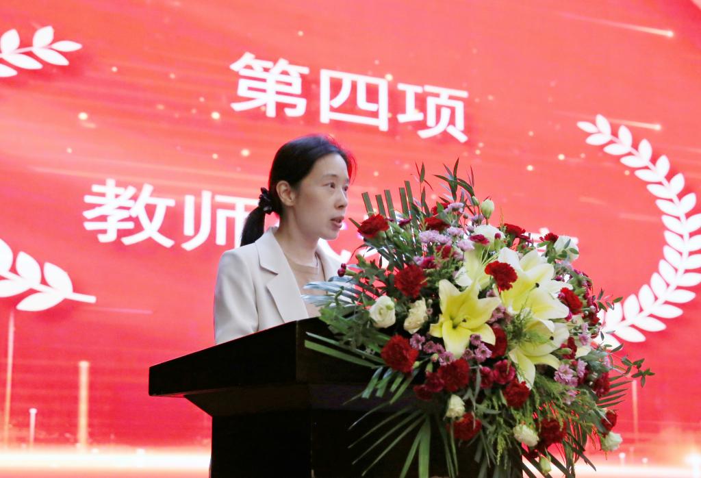 学生代表电信系曾一丹同学在发言中对各位老师致以节日的问候,感恩老师的辛勤付出和关怀指导。随后,由教授会主席王海民教授上台领誓,全体新入职教师上台并右手握拳宣誓,做出庄严的师德承诺。