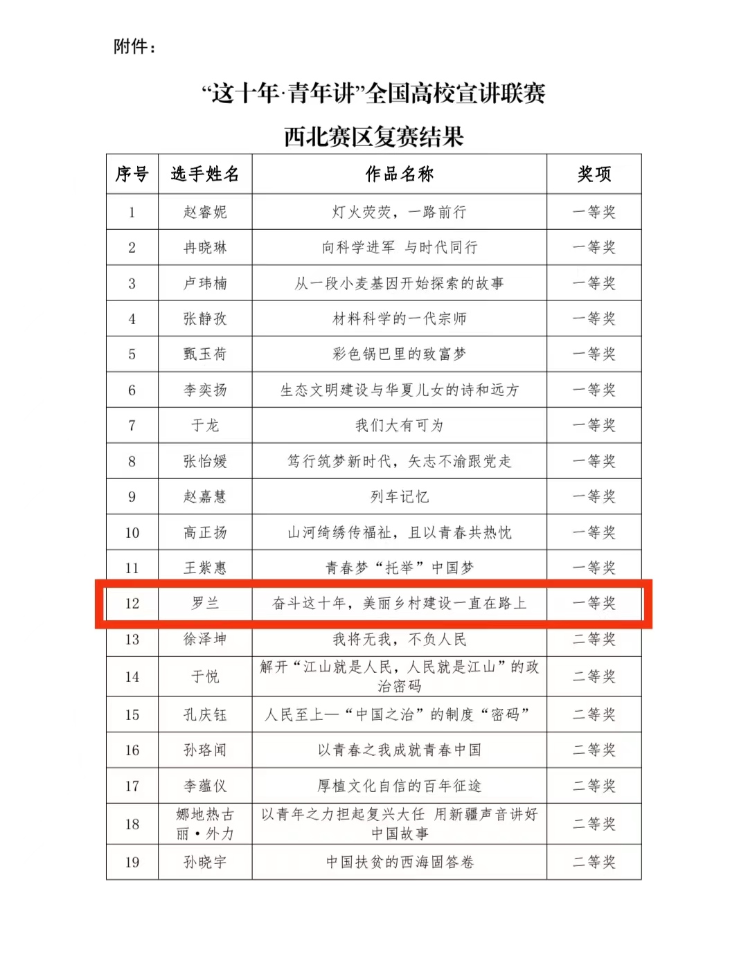 本次西北赛区共有西安交通大学、西北工业大学、西北农林科技大学、西安电子科技大学等17所高校的43名参赛选手参加,我院宣讲团罗兰同学在西北赛区以《奋斗这十年,美丽乡村建设一直在路上》为题目进行宣讲并获一等奖。