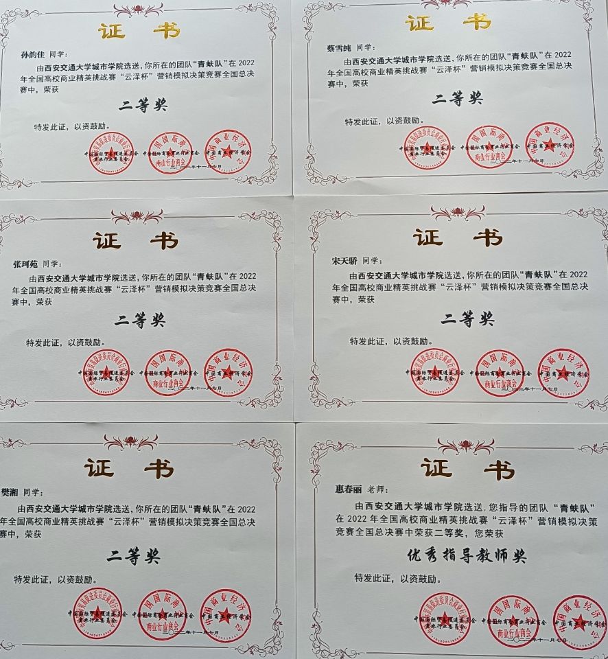 11月5日至6日,由中国国际贸易促进委员会商业行业委员会、中国国际商会商业行业商会与中国商业经济学会共同主办,中国国际贸易促进委员会商业行业委员会、北京中商汇才教育管理咨询有限公司与北京云泽科技有限公司承办的2022年全国高校商业精英挑战赛“云泽杯”营销模拟决策竞赛全国总决赛圆满结束,我院管理系孙韵佳、蔡雪纯、宋天娇、张珂苑、樊湘组成的“青蚨队“与全国118所高校的538支队伍同台竞技,最终获得“全国二等奖”,惠春丽老师获得“优秀指导老师奖”。
