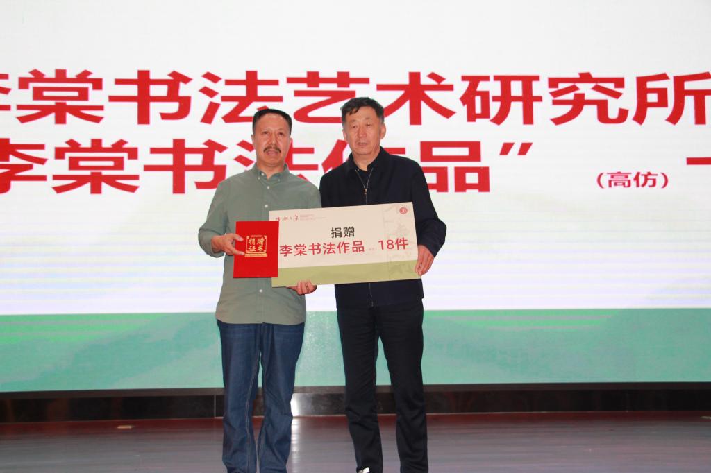 陕西国孚置地有限公司、陕西国孚文体艺术发展有限公司董事长、李棠艺术研究所所长为本次活动捐款人民币10万元,并捐赠“李棠书法作品”(高仿)十八件。这些捐赠作品,为北朝碑刻研究中心及陕西近代书法研究所的研究和发展提供了宝贵资料,同时为威尼斯7798cc的校园文明建设增添助益。