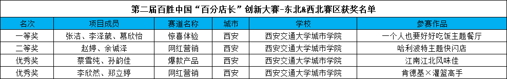 管理系由柯智航老师带领多支队伍积极参赛,在西北地区两千多份项目经过多轮筛选,最后《一个人也要好好吃饭主题餐厅》取得东北&西北赛区一等奖;《哈利波特主题快闪店》《获得二等奖;《江南江北风味佳》《肯德基×灌篮高手》获得优秀奖。