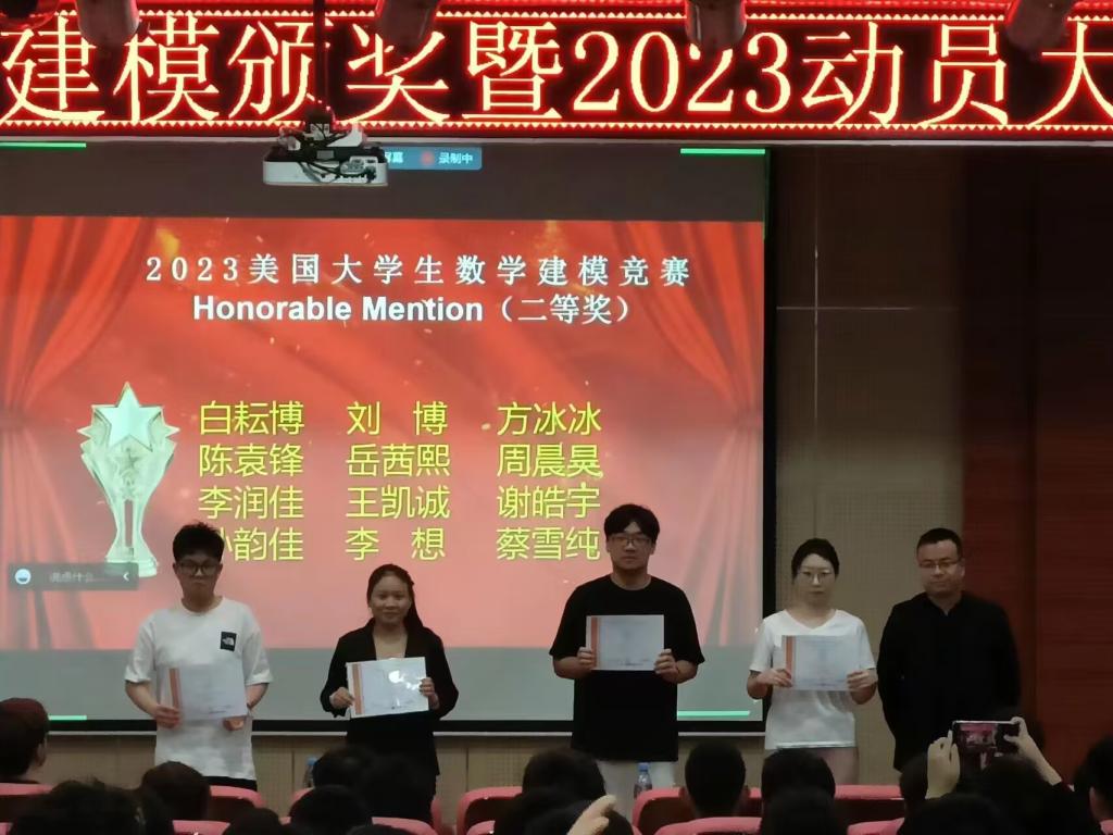 会议伊始,主持人宣读2022全国大学生数学建模竞赛及2023美国大学生数学建模竞赛获奖学生名单,与会领导及教师分别为获奖学生颁发获奖证书并合影留念。2022年全国大学生数学建模竞赛我院共获省一等奖5项、省二等奖9项,同时,学院荣获优秀组织工作奖;2023美国大学生数学建模竞赛获F(特等提名)奖1项、H(二等奖)奖4项、S(三等奖)奖28项。随后,优秀获奖队伍代表张秦阳同学分享了自己的参赛历程与获奖经验。