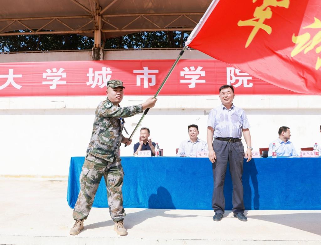 陈光德院长向军训团授旗并宣布2022、2023级学生军训正式开训。大会在雄壮的《中国人民解放军进行曲》歌声中落下帷幕。