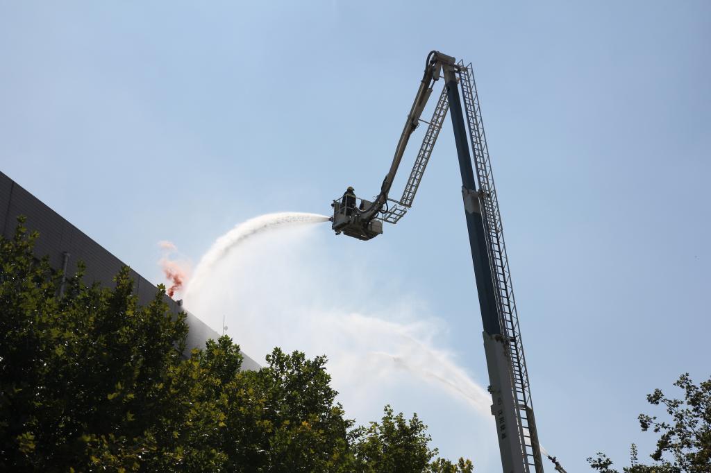 同时,西安经开消防救援大队鸿明路救援站在教学楼D楼开展消防救援安全演习,演习过程中使用云梯消防车对顶层着火点进行扑火,为现场军训团全体师生上演了一堂生动的消防救援实践课。