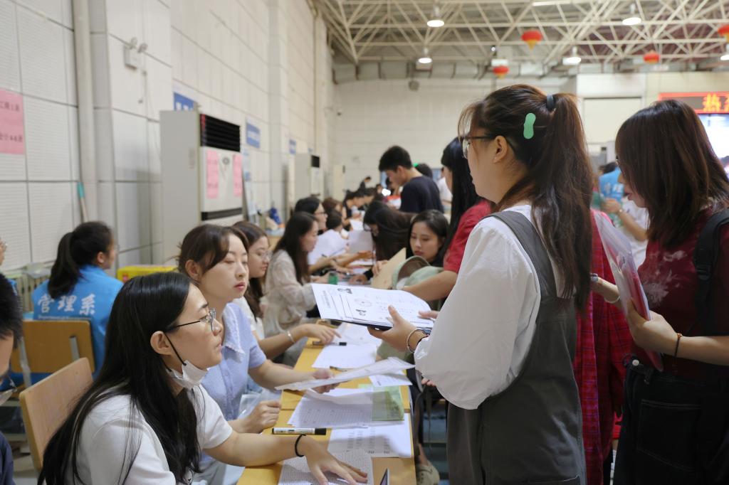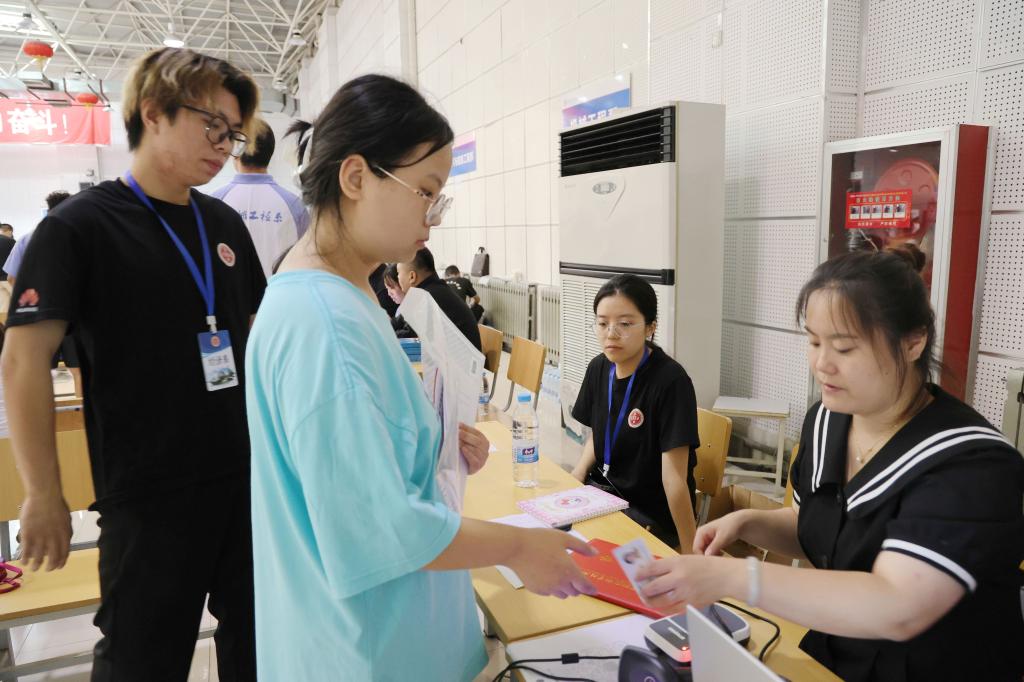 报到现场,设置了流程咨询、资格审核、学费缴纳、助学贷款办理等环节,并且开设绿色服务通道,安排志愿者全方位协助新生完成报到各项事宜。