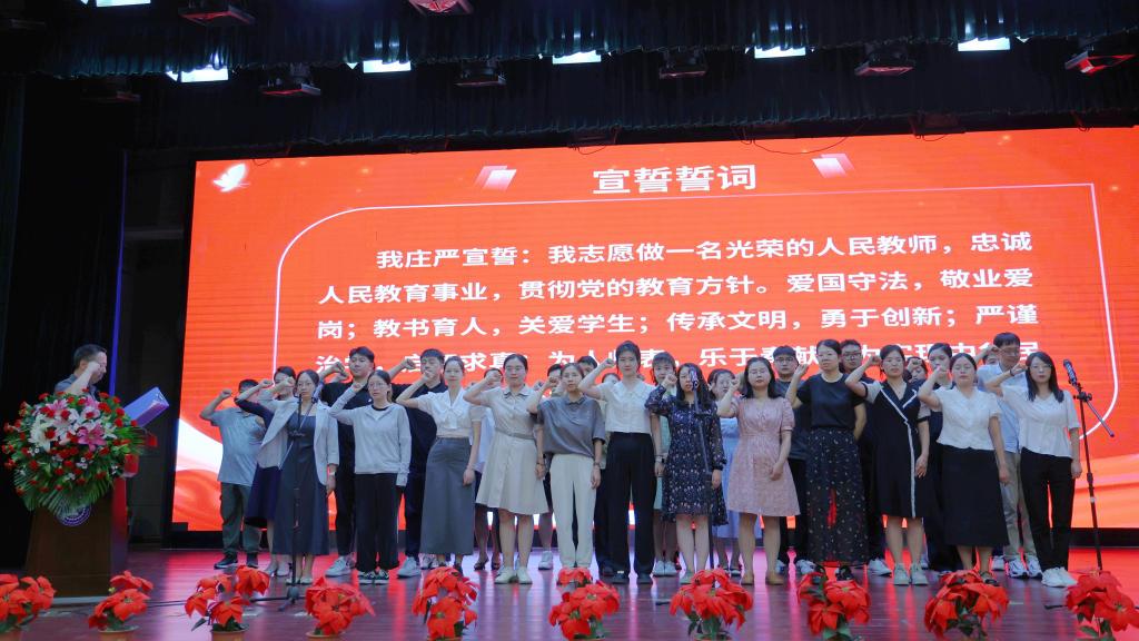 会上,教授会主席解安宁教授领誓,全体新入职教师右手握拳宣誓,做出庄严的师德承诺。