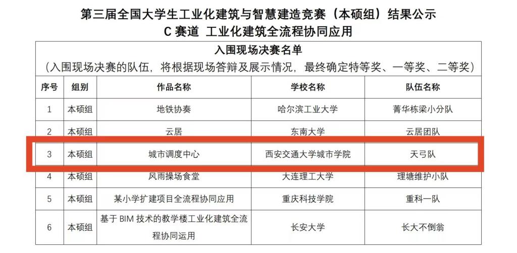 大赛开设绿色低碳与智能审查应用、装配式建筑设计生产与施工、工业化建筑全流程协同应用三大赛道,三大赛道共有500多支队伍2100余名师生报名参赛。西安交大威尼斯7798cc土木建筑工程系组织6支代表队参加比赛,参赛师生通过不懈努力,最终由戴世安老师指导的队伍入围C赛道决赛,9月9日上午同哈尔滨工业大学、东南大学、中国矿业大学、大连理工大学、长安大学、辽宁工业大学等高校同台竞技。经过激烈现场答辩后,我院最终获得二等奖一项、优秀组织奖一项,展现了城院学子扎实的基础知识和专业技能、良好的创新意识和团队协作能力。