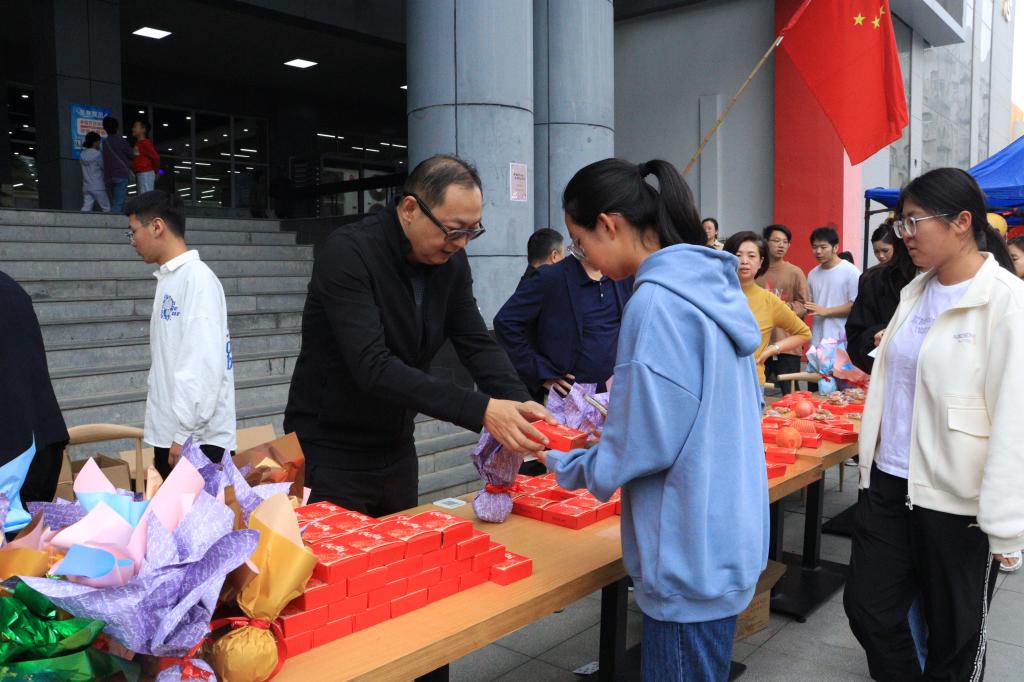 9月29日,学生服务中心在中快广场举办“盈月揽芳华 美好共此时”师生共庆中秋活动。学院党委书记张爱萍,学生服务中心主任辛红伟,副主任姚敏、吴昊翔、茹静,学院工会副主席张福全及学生中心全体老师来到活动现场慰问双节留校学生,为他们送去月饼和节日祝福。