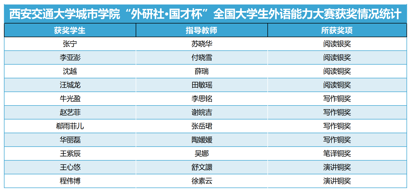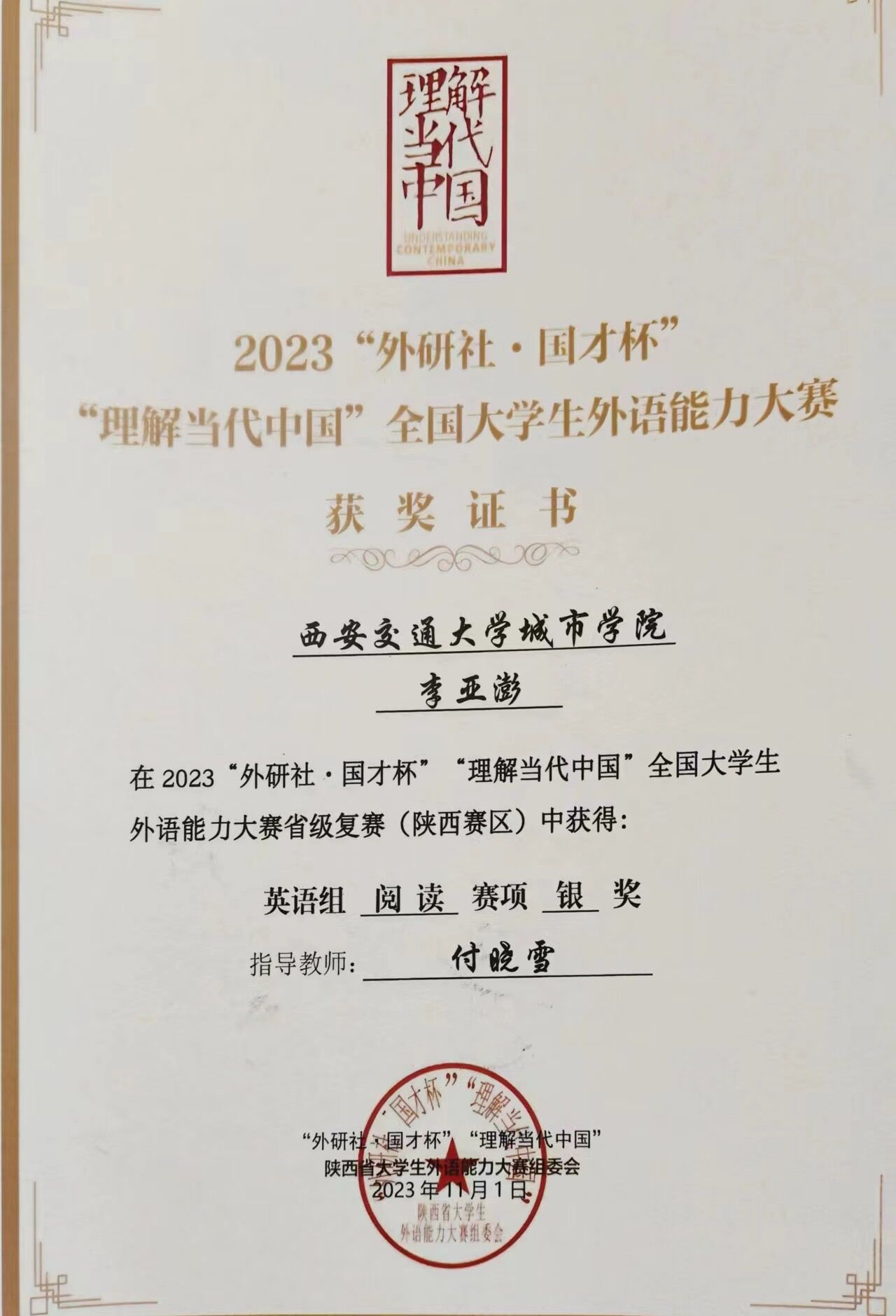 据悉,“外研社·国才杯”“理解当代中国”全国大学生外语能力大赛旨在引导大学生坚定文化自信、提升综合素养,推动话语表达与时代精神同向同进。是大学生呈现风采、展示自我的广阔舞台,也是外语教育领域体现智慧、展现创新的沟通平台。自赛事启动以来,外国语学院选派专业课教师担任指导教师,对选手进行赛前辅导、培训。最终,张宁等四位同学在阅读复赛中荣获省级银奖两项、省级铜奖两项;牛光盈等四位同学在写作复赛中荣获省级铜奖;王心悠、程伟博在演讲比赛中荣获省级铜奖;王紫辰在笔译复赛中荣获省级铜奖。获奖同学不仅在比赛过程中展现了过硬的语言功底,同时展示出城院学子的思辨能力、语言表达能力和跨文化交际能力。近年来,外国语学院重视学生实践创新能力培养,鼓励学生参加各级各类英语竞赛,提高了学生的思辨能力,拓宽了国际视野。