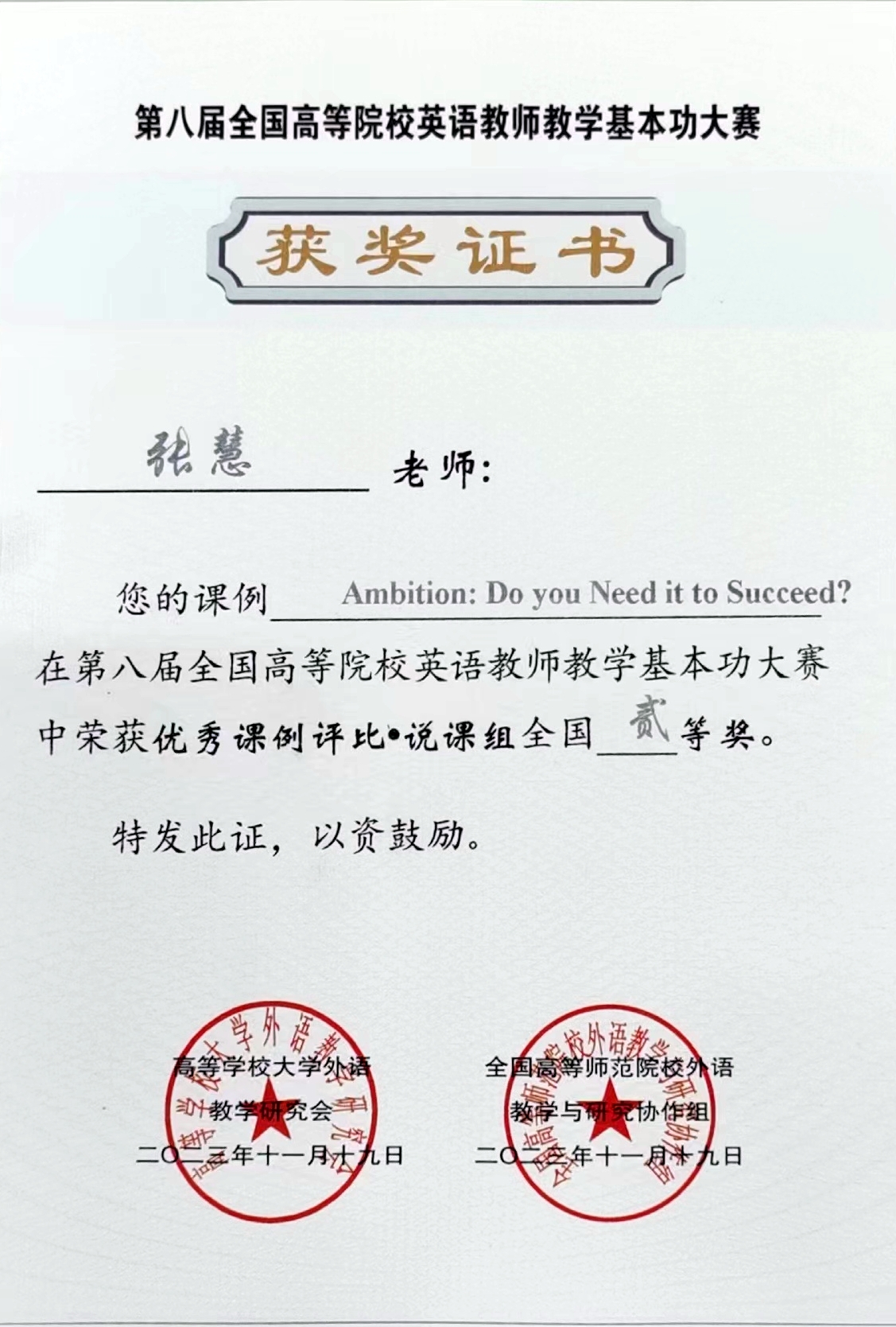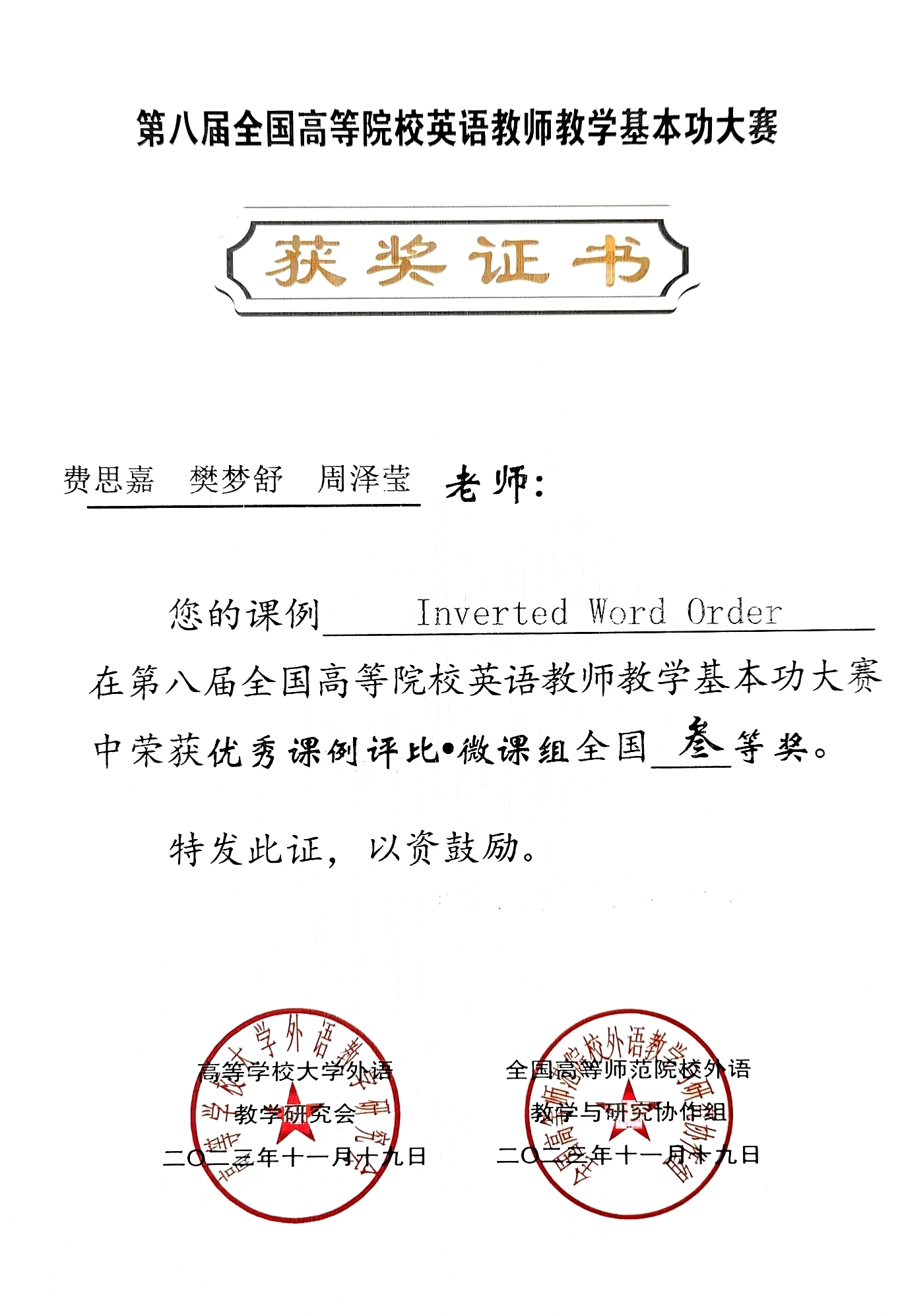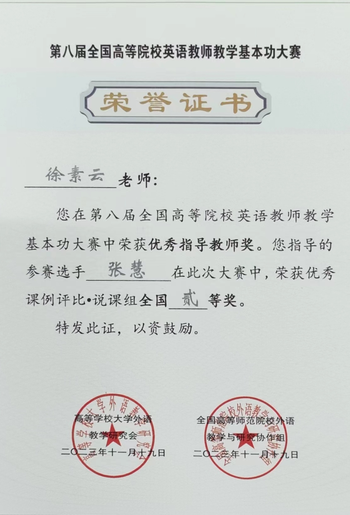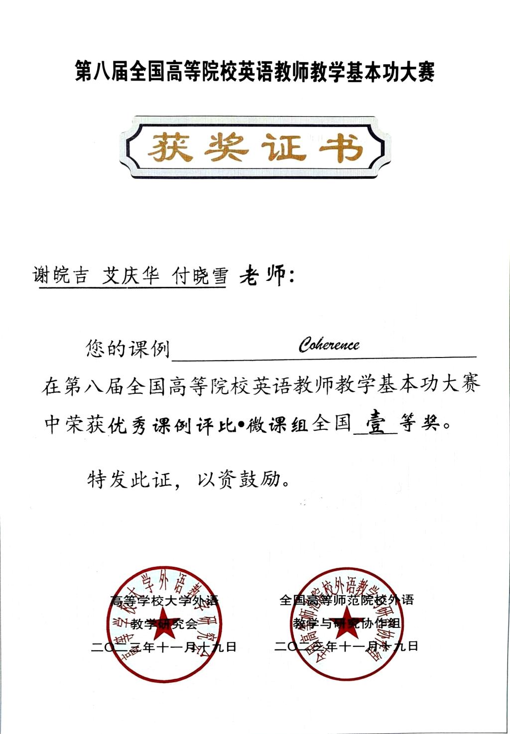 在微课组国赛评比中,谢皖吉、艾庆华、付晓雪的微课(Coherence)荣获“优秀课例评比·微课”组全国一等奖;在说课组国赛评比中,张慧的说课(Ambition: Do you Need it to Succeed?)荣获“优秀课例评比·说课”组全国二等奖、陕西省一等奖;费思嘉、周泽莹、樊梦舒的微课(Inverted Word Order)荣获“优秀课例评比·微课”组全国三等奖;徐素云荣获“优秀指导教师奖”。
