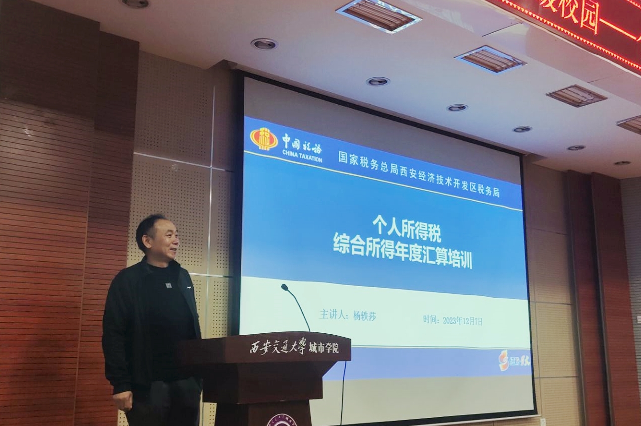 12月7日,国家税务总局经开区税务局所得税科科长周阳、所得税科干部杨轶莎、草滩税务所所长杨晨、草滩税务所副所长王浩一行四人来校开展主题为“个税宣传进大学,枫桥服务暖校园”的个人所得税年度汇算清缴实操宣讲会。此次宣讲会由财务处、组织人事处联合举办,全校教职员工积极报名参与。