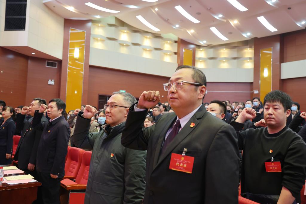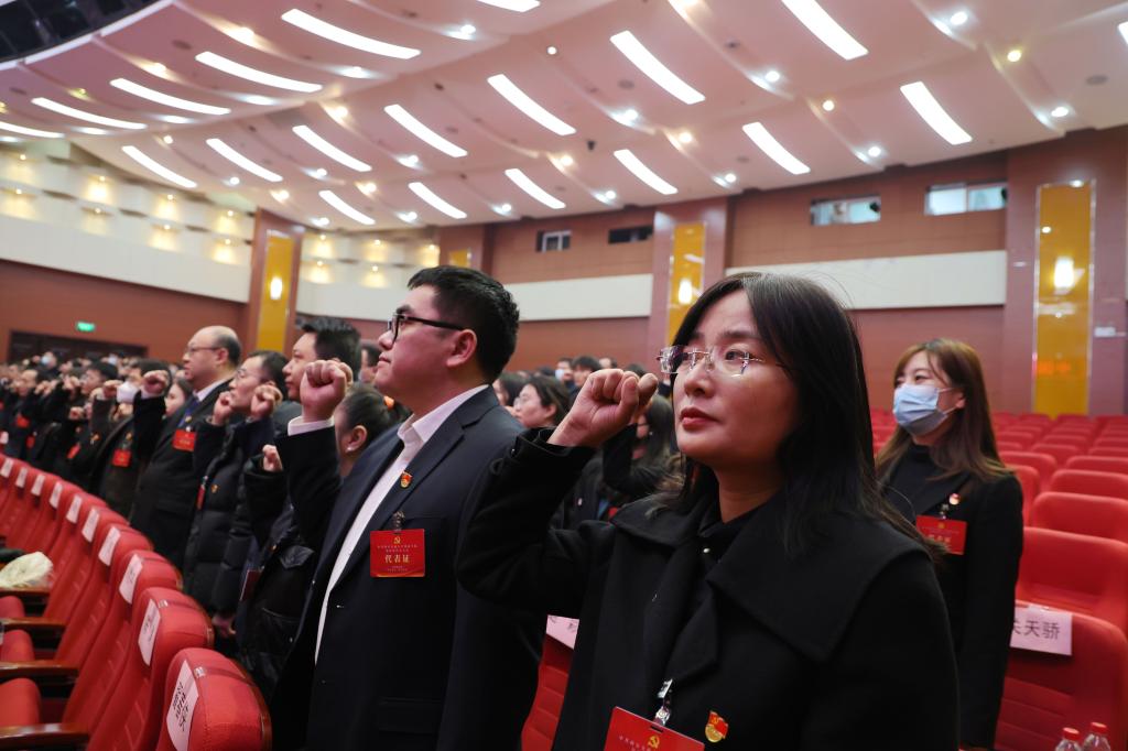 会场氛围庄重热烈。主席台上金色的党徽与十面鲜艳的红旗相映生辉。大会在雄壮的国歌声中拉开帷幕。随后,全体党员重温入党誓词。