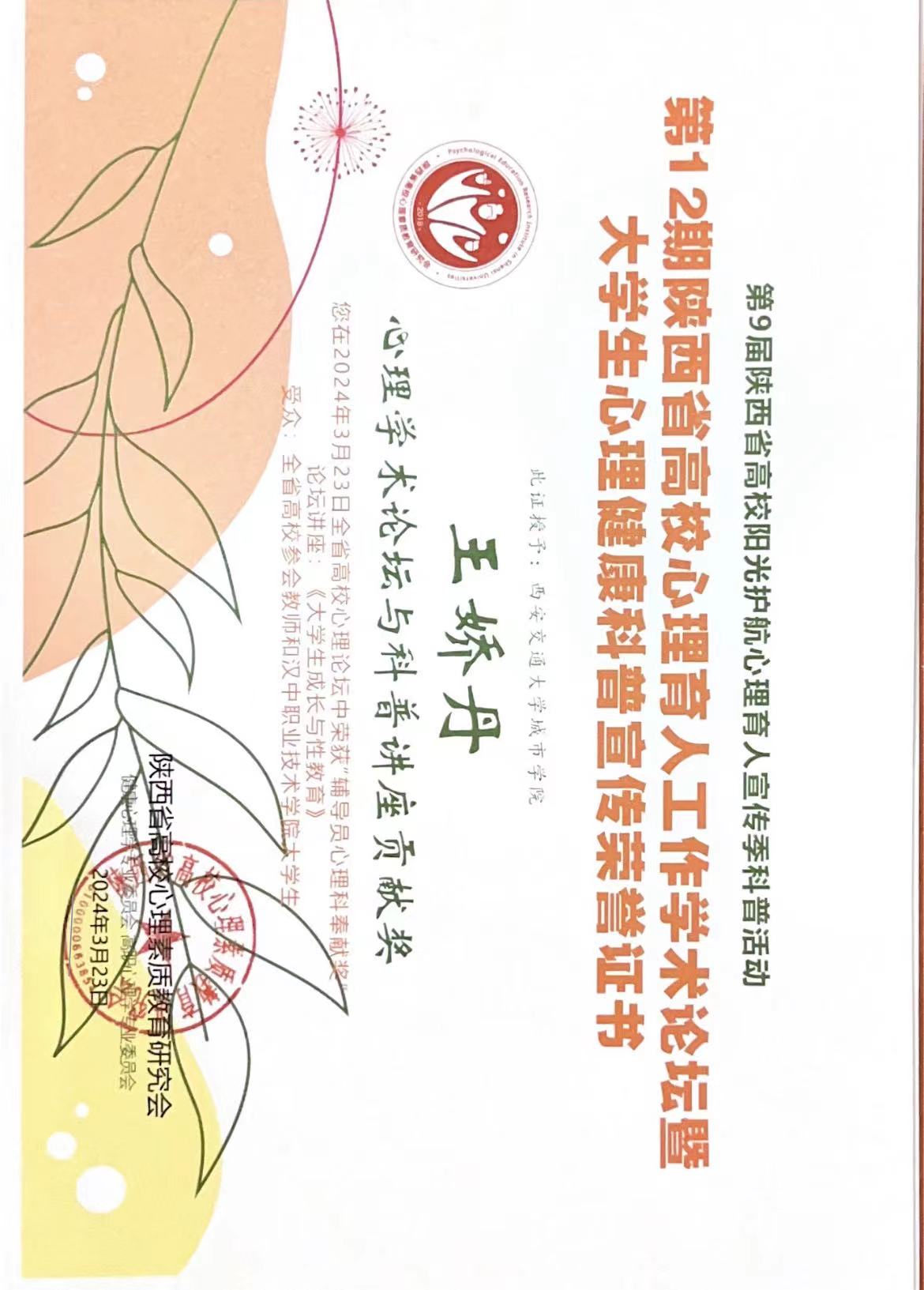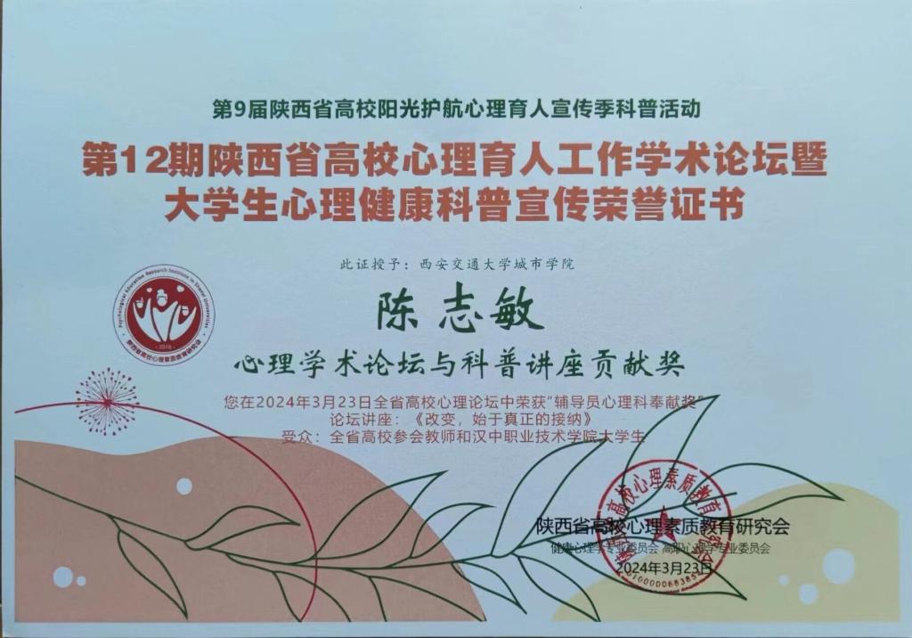 本次论坛的主题是教育部数字化教育战略与陕西省高校数字心理育人。分为专家报告、学者论坛、科普宣传、艺术疗愈和成果评选五部分,相关专家和学者分享了各自研究成果和实践经验。陈志敏和王娇丹分别在汉中职业技术学院护理学院和医技学院开展心理健康知识科普宣传,并获得心理学术论坛与科普讲座贡献奖。在第二届健康心理学专业委员会改选换届大会中,学生工作处姚敏副处长当选为副主任委员之一,陈志敏当选为专业委员之一。