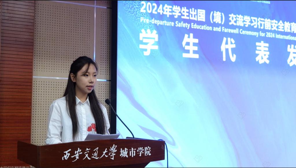 在国歌声中,大会正式开始。金融国际2201班的王鹏宇同学作为出国学生代表进行了全英文发言。她感谢母校栽培,并表达了对未来留学生涯的坚定信心与热切期望。她呼吁在场所有出国学生铭记身份,以感恩之心求学探索,实现个人价值。