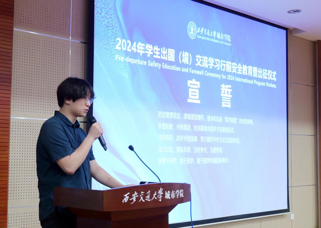 在计算机学院计算机国际2101班王子锐同学带领下,2024年出国(境)26名学生集体宣誓:坚定理想信念,厚植爱国情怀,继承和弘扬“留学报国”的光荣传统。外塑形象,内修素质,时刻展现中国学子的青春风采。求同存异,讲好中国故事,努力做好中外文化交流的桥梁。全力以赴、锤炼本领,为校争光,为国争荣,做勇于有梦、敢于逐梦、勤于圆梦的城院新青年!