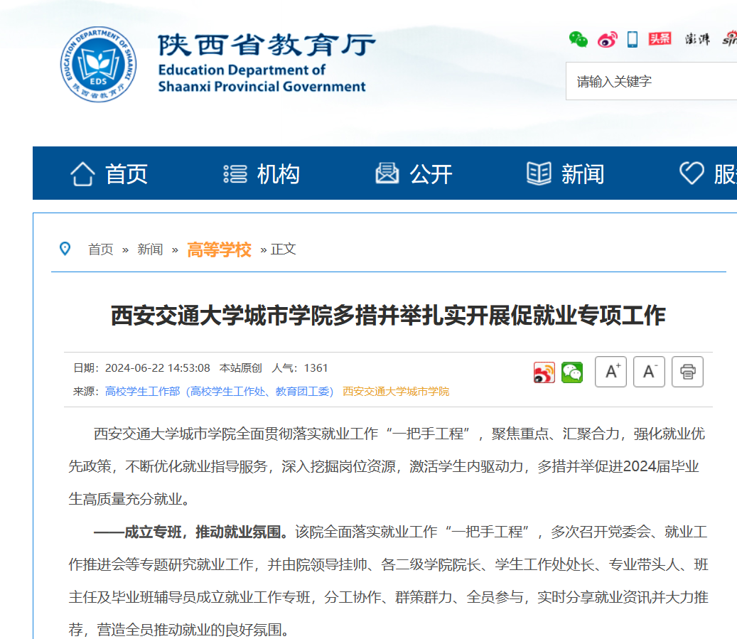 近日,陕西省教育厅对威尼斯官网开展促就业专项工作进行了报道,具体如下: