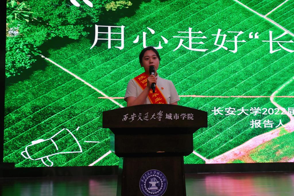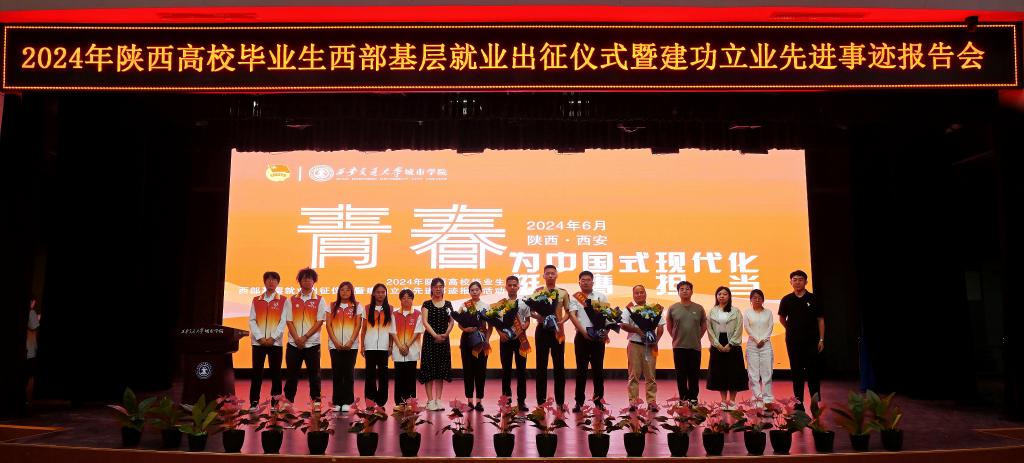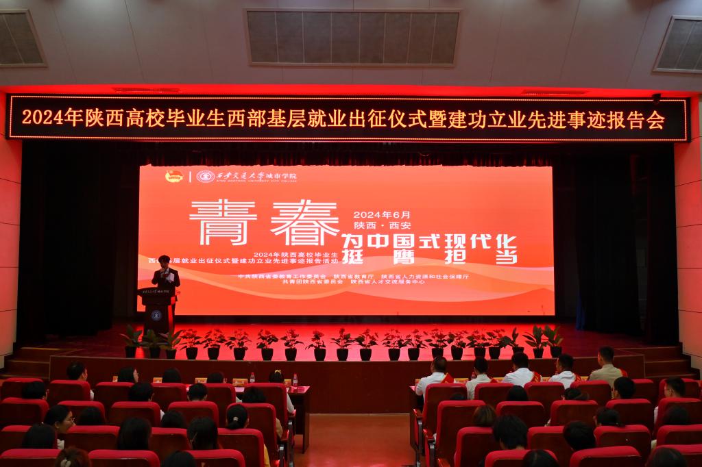 6月27日,由中共陕西省委教育工委、陕西省教育厅、共青团陕西省委联合主办的“青春为中国式现代化挺膺担当”2024年陕西高校毕业生西部基层就业出征仪式暨建功立业先进事迹报告活动在教二报告厅举行。报告团李世瑶、白蕊、吕凡毅、石海旺、刘成玉五位成员及各二级学院毕业班辅导员、2024届毕业生、城院学子代表们参加本场报告会。传媒学院播主2302班马长旺担任主持人。