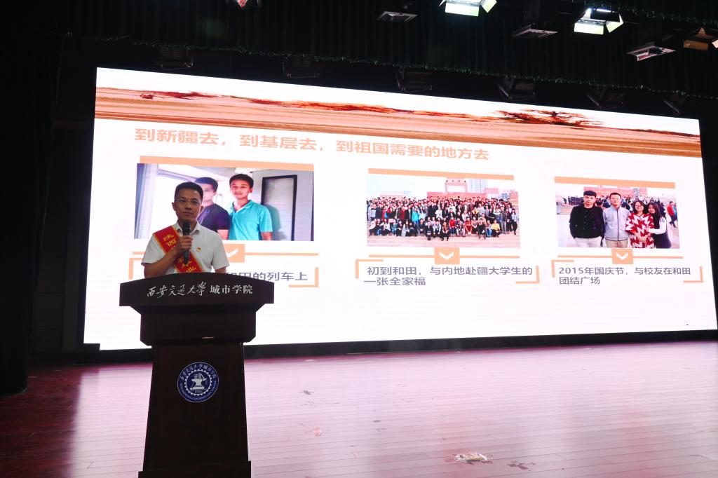 陕西科技大学2015届本科毕业生,新疆和田市伊里其乡第一中心小学任党建指导员石海旺阐述了从东北到西北的跨度,支撑自己的是“到新疆去,到基层去,到祖国需要的地方去”的信念。在他身上生动体现了“各民族像石榴籽一样紧紧抱在一起”。