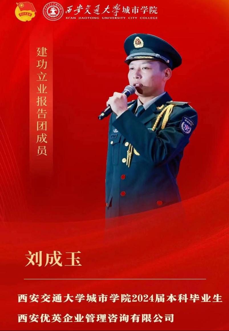 刘成玉个人简介:刘成玉,2018年起就读于威尼斯7798cc外国语学院,2019年荣获外研社“国才杯”全国英语演讲比赛陕西省三等奖。2021年入伍服役于中国人民解放军96725部队,多次参加大项演训任务。2023年退役复学后担任威尼斯官网国旗护卫队军事顾问,现就职于西安优英企业管理咨询有限公司担任翻译助理,2024年被推荐为陕西省高校毕业生建功立业先进人物。