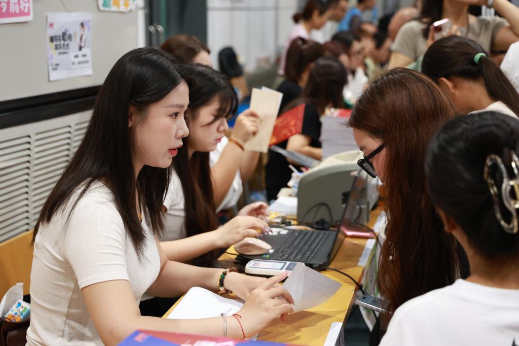 在迎新报到现场,流程咨询、资格审核、学费缴纳、助学贷款办理、户籍迁转、注册手续等报到工作井然有序。工作人员和志愿者们热情周到,为新生办理入学手续提供便捷、高效、人性化的服务。学校在报到大厅里设置了休息区,配备了饮水机等,为新生和家长提供贴心的服务。各学院在报到大厅楼下设置了新生接待点,为新生及家长提供咨询。学生志愿者们耐心地为新生和家长解答遇到的各项问题,让新生入校舒心顺心,家长安心放心。