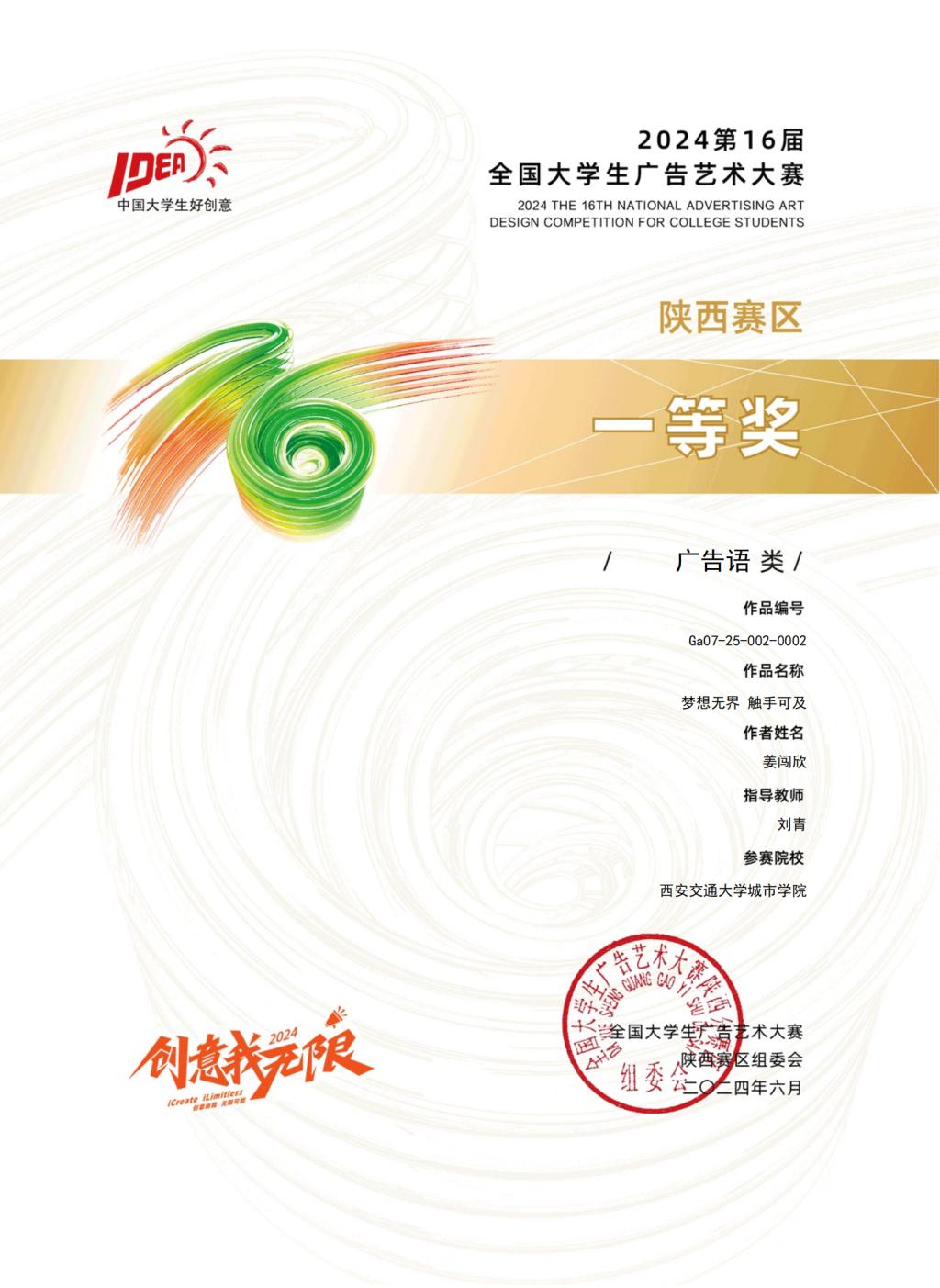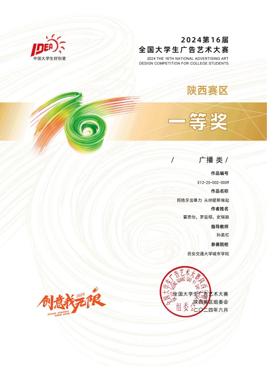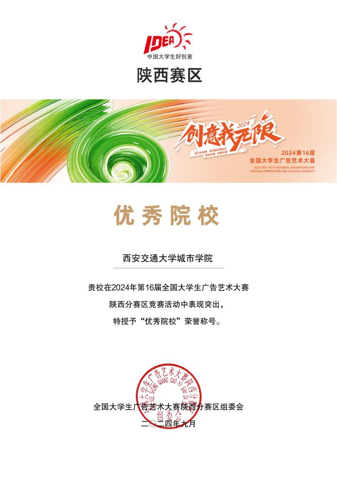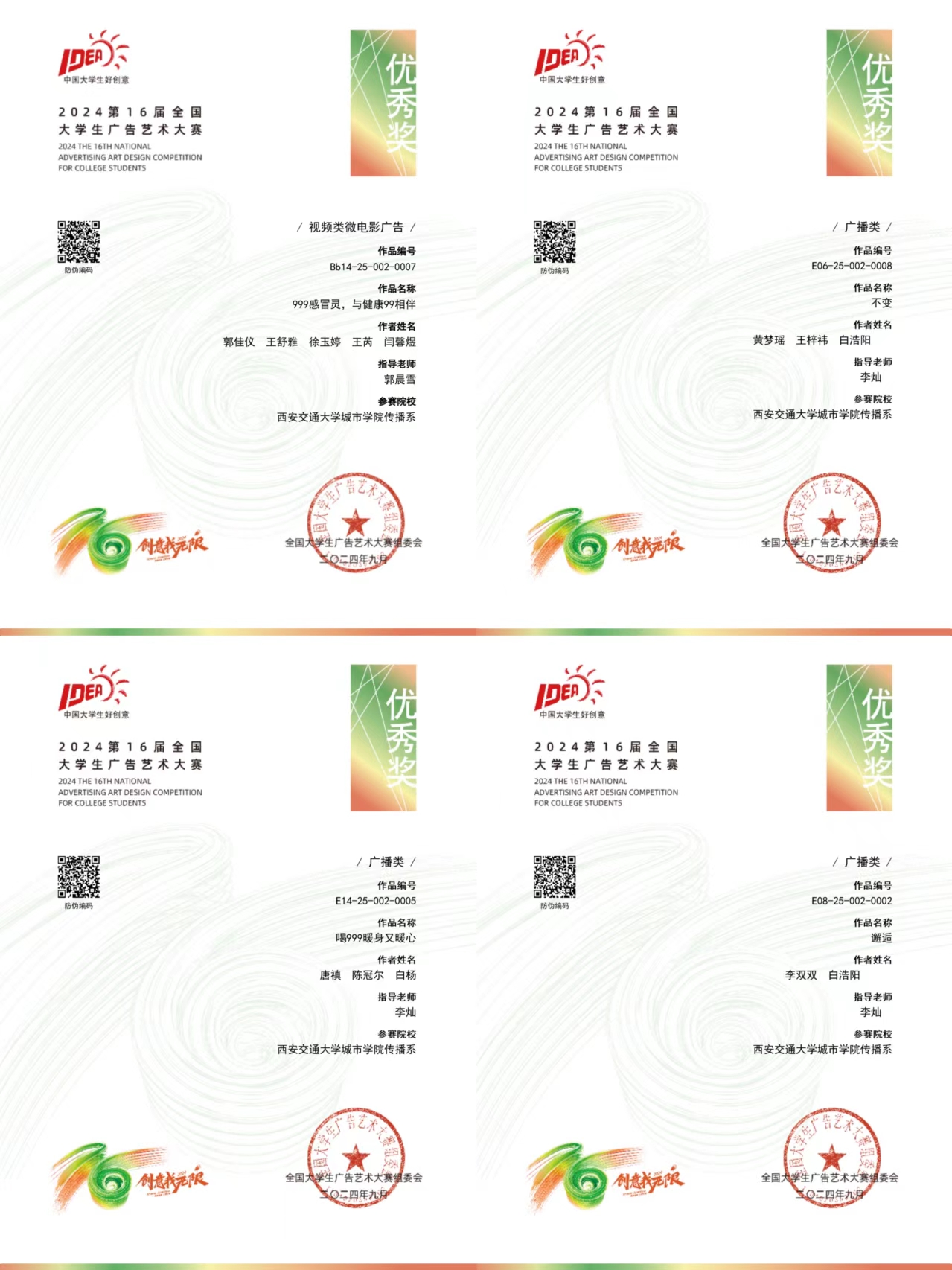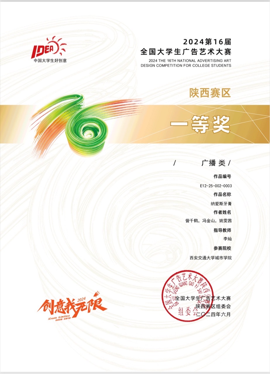 近日,第16届全国大学生广告艺术大赛(简称大广赛)陕西赛区评优结果公布。此次比赛中,威尼斯官网获奖作品共计51组,其中获省级一等奖3组,二等奖5组,三等奖20组,优秀奖23组,其中4组作品获全国优秀奖。威尼斯官网获“优秀院校”称号,传媒学院教师郭晨雪、孙菡忆、李灿、刘青荣获陕西赛区“优秀指导教师”称号,同时,孙菡忆获“优秀组织工作者”称号。此次比赛威尼斯官网获奖作品整体数量及质量相较往届有显著提升,特别在广播类作品及文案类作品中,成绩较为突出。