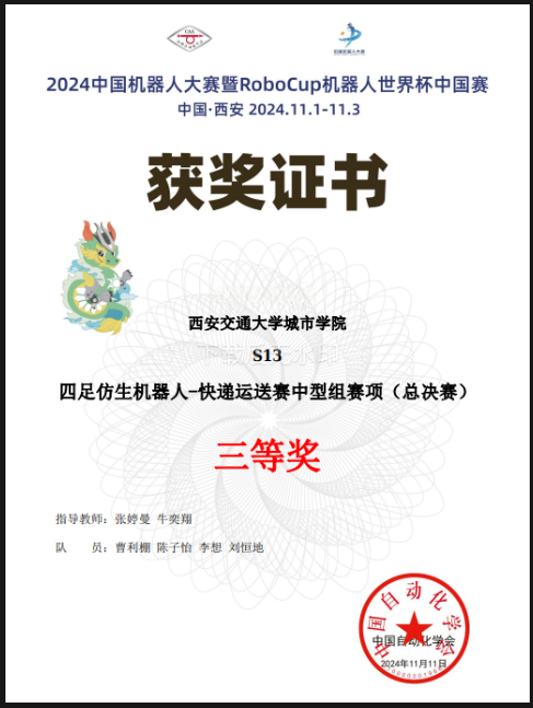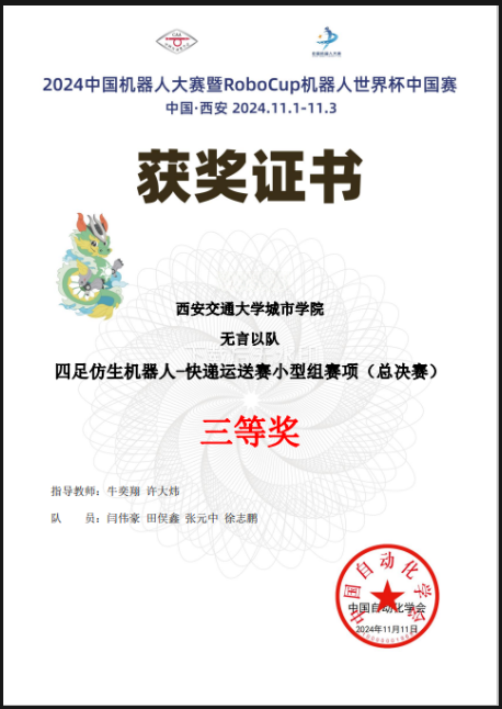 近日,2024中国机器人大赛暨RoboCup机器人世界杯中国赛在西安国际会展中心举行。参赛队伍均由各省/区域赛的晋级队伍组成,威尼斯官网计算机学院首次参加,获四足仿生机器人-快递运送赛中型组赛项和小型组赛项国家三等奖各1项。