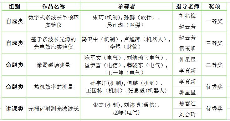 自选类作品“基于多波长光源的光电效应实验仪”所属团队自制实验装置,成功扩展了现有仪器的使用范围,实现了光学实验集中于一个平台的创新方案,为教学中的创新思维训练提供了新思路与方法。命题类作品“微弱磁场测量”所属团队利用光学放大原理,出色地完成了地磁场大小和方向的测量,体现了实验方法的创新运用。两个团队均获得三等奖。