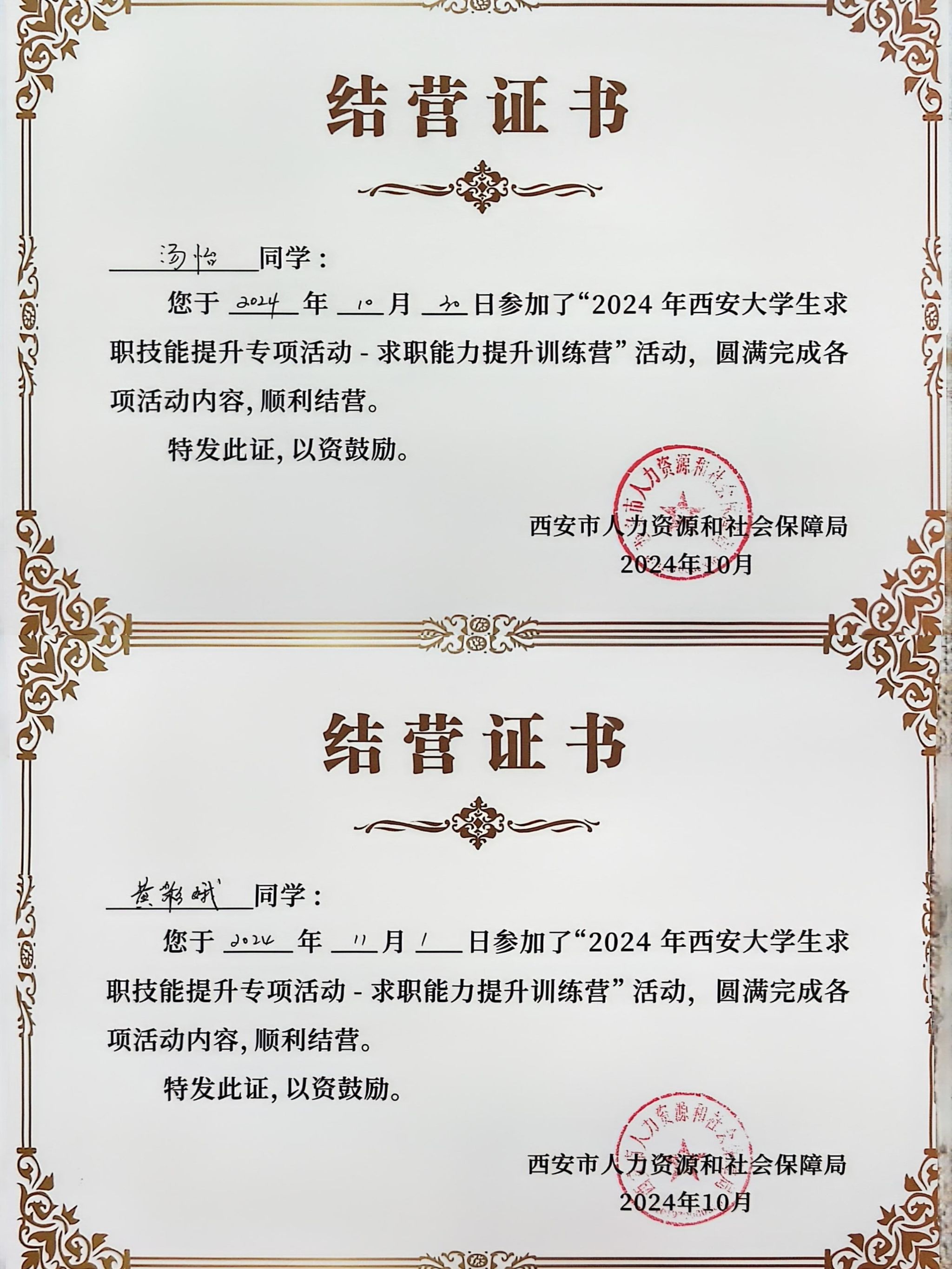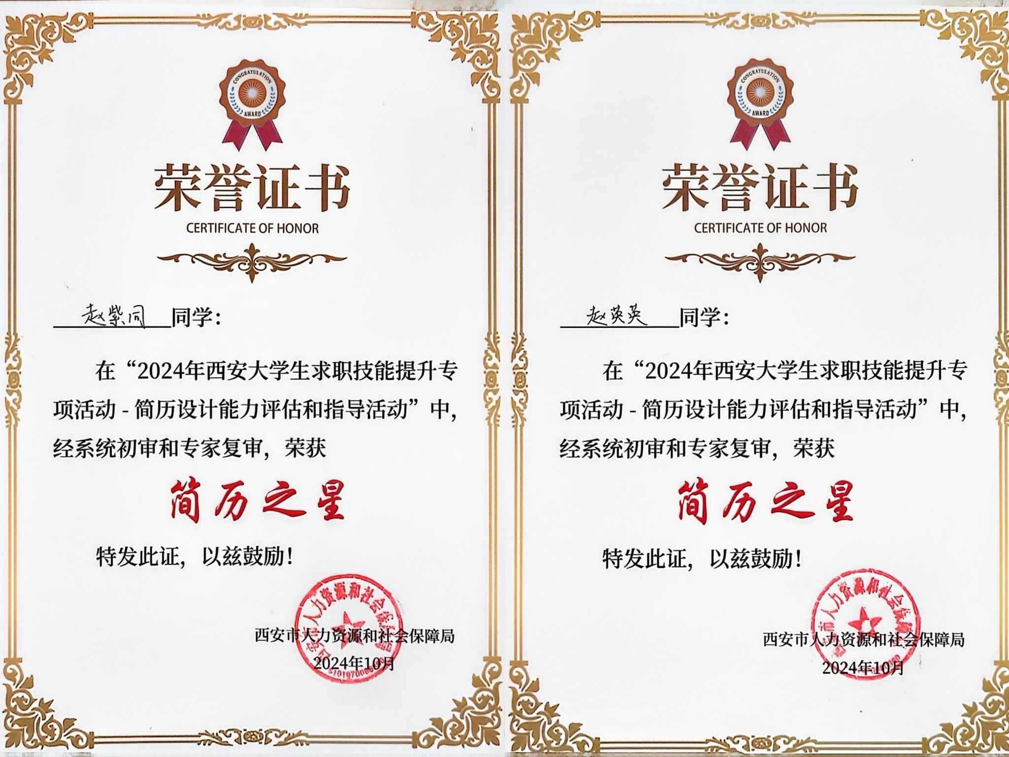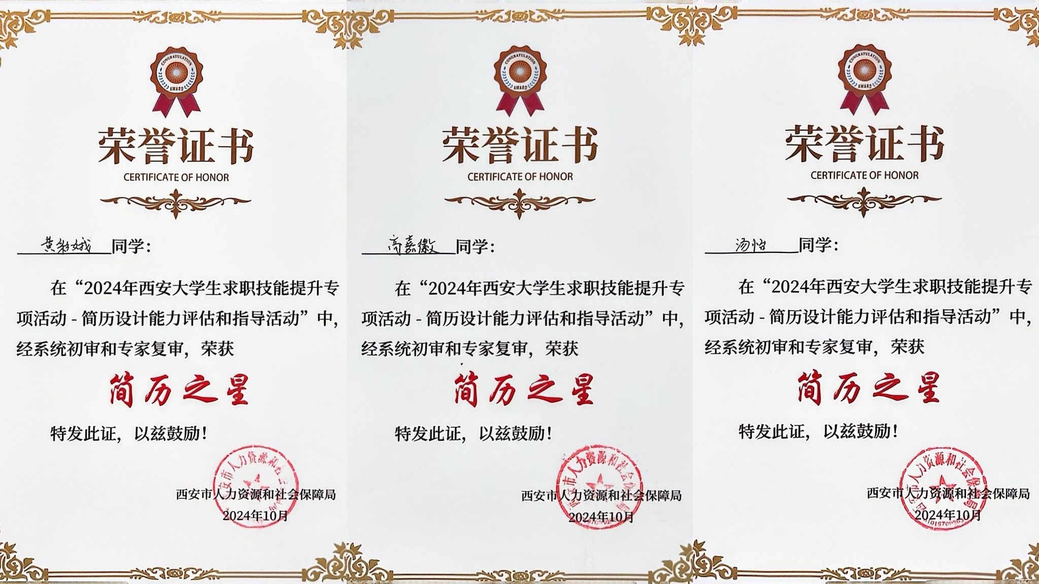 近日,2024年西安大学生求职技能提升专项活动圆满落幕,威尼斯官网学子凭借出色的综合素质和求职实践能力,在本次活动中表现优异。黄彩娥等5名学子获“简历之星”称号,汤怡等2名学子获“求职能力提升训练营”结营证书。此外,学校被西安市人力资源和社会保障局评为“2024年西安大学生求职技能提升专项活动最佳组织奖”。