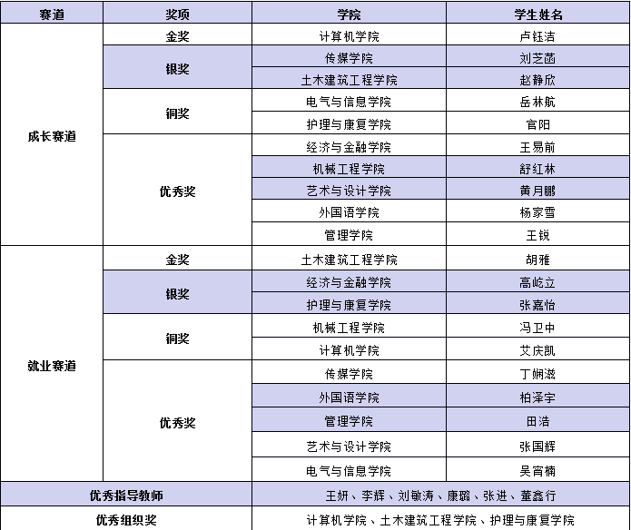 经过激烈的角逐,两个赛道最终产生2个金奖、4个银奖、4个铜奖、10个优秀奖;王妍等6名教师获“优秀指导教师”称号;计算机学院、土木建筑工程学院、护理与康复学院获大赛“优秀组织奖”。