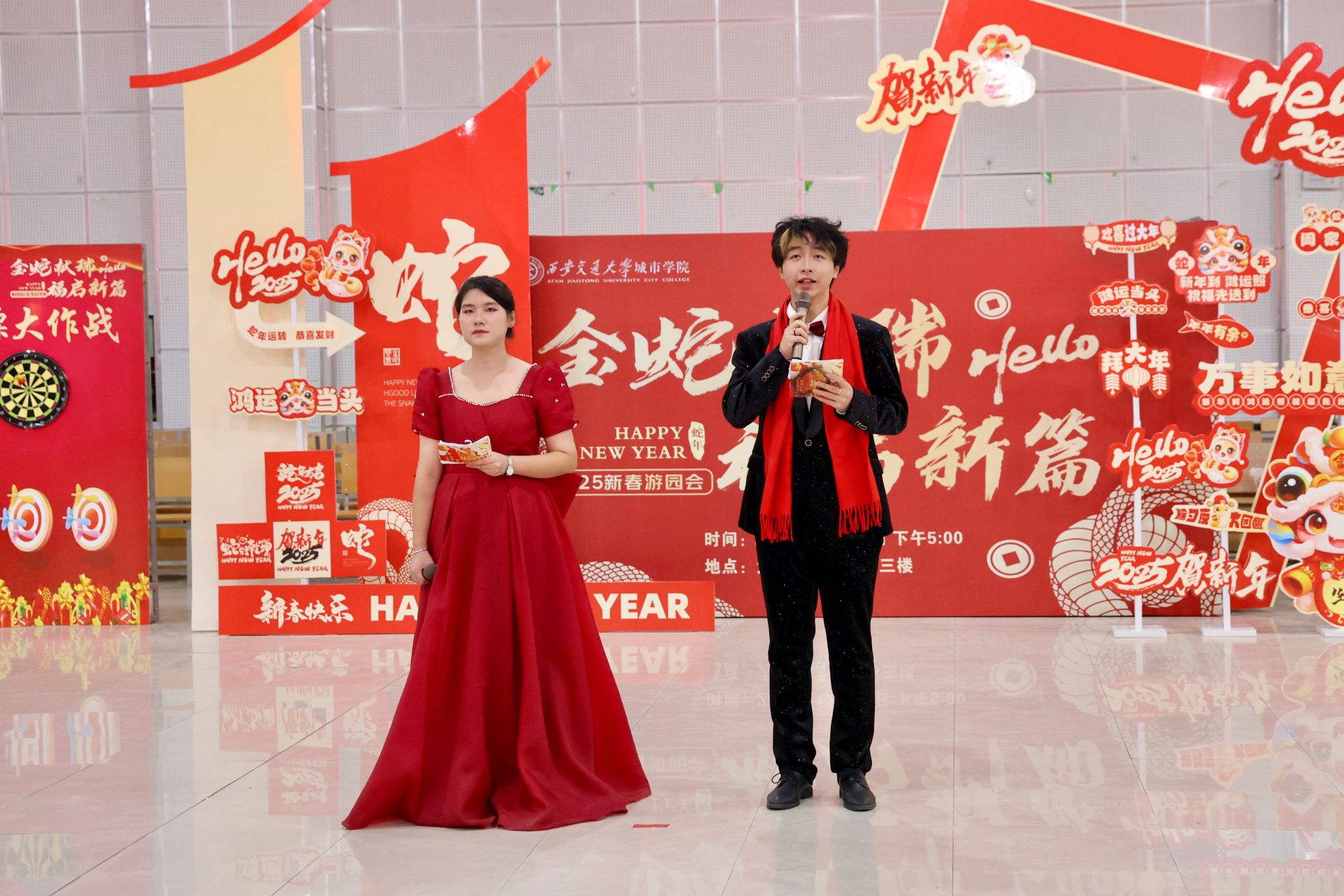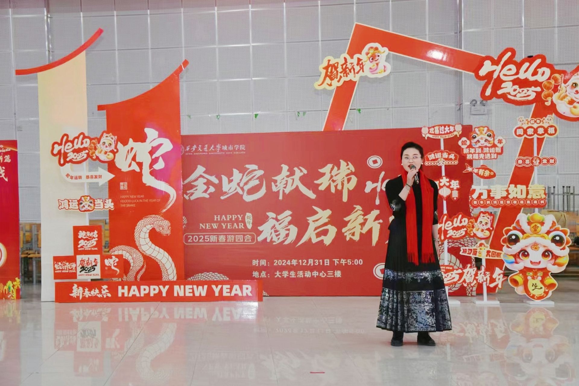 为迎接新年到来,营造浓厚的节日气氛,使全校师生体验中华传统文化和非遗文化的魅力。威尼斯7798cc于2024年12月31日在大学生活动中心三楼举办了“金蛇献瑞,福启新篇”2025新春游园会。校长严红昌、党委书记张爱萍、副校长陈书荣、副校长朱旭、副校长岳华海、工会主席许恩奇、纪委书记袁晓蕾及各二级学院领导、师生代表参加了本次游园会。游园会由经济2402王蒙恩及护理2403史琪妙两位同学主持。