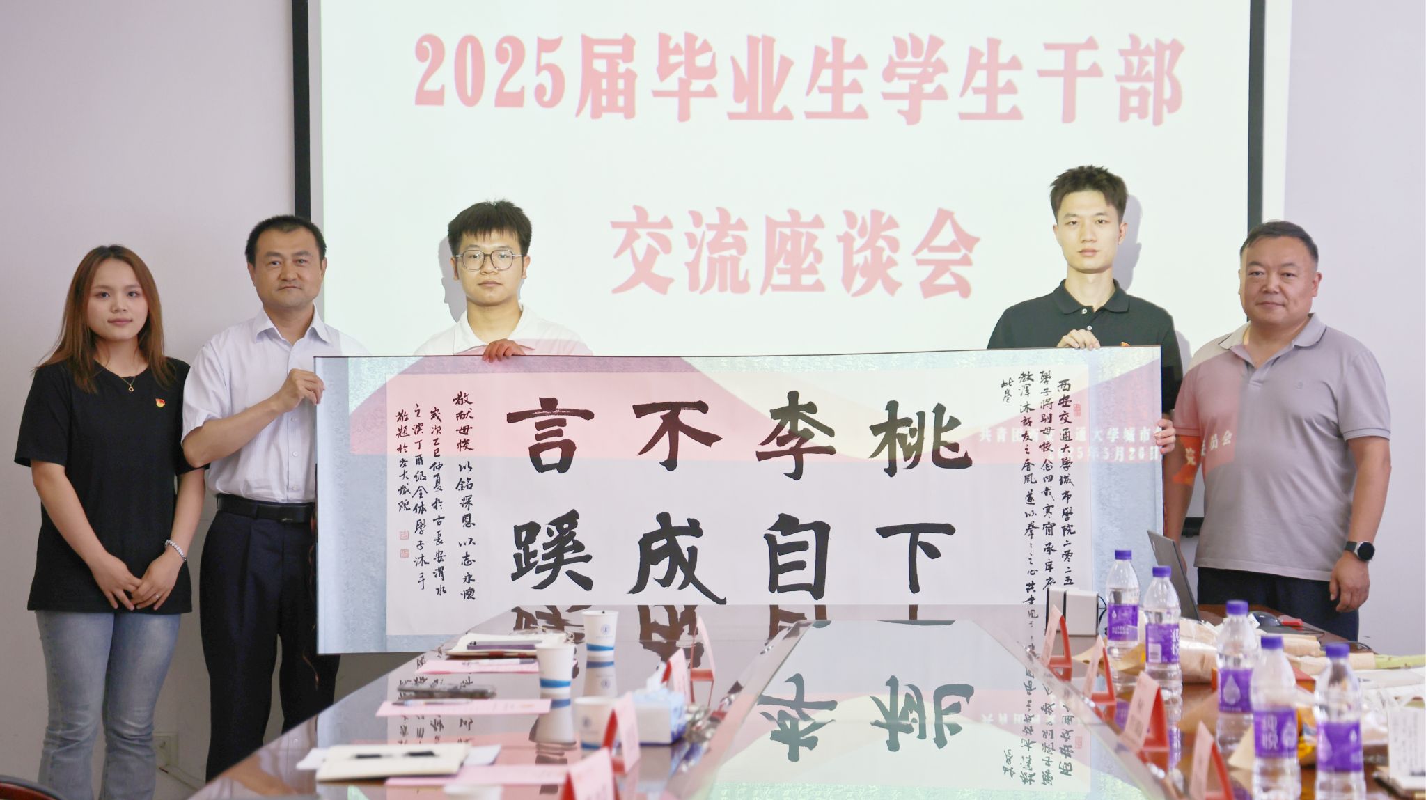 党委书记严红昌和党委副书记、副校长陈书荣代表学校为毕业生送上向日葵花束和定制文创礼盒,祝福毕业生们向阳而生、追光而行。毕业生们也准备了书法作品,祝愿母校“桃李不言,下自成蹊”。
