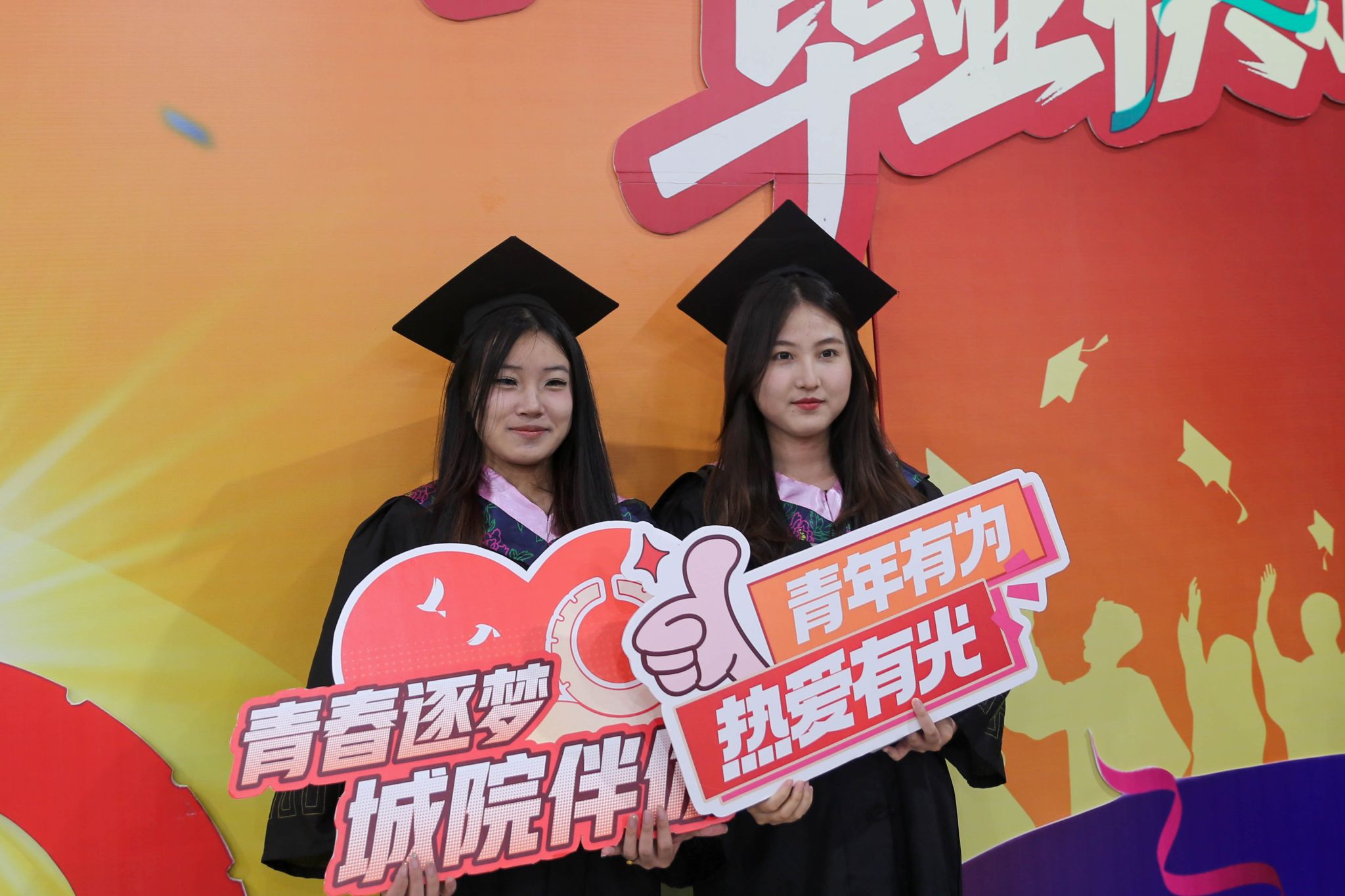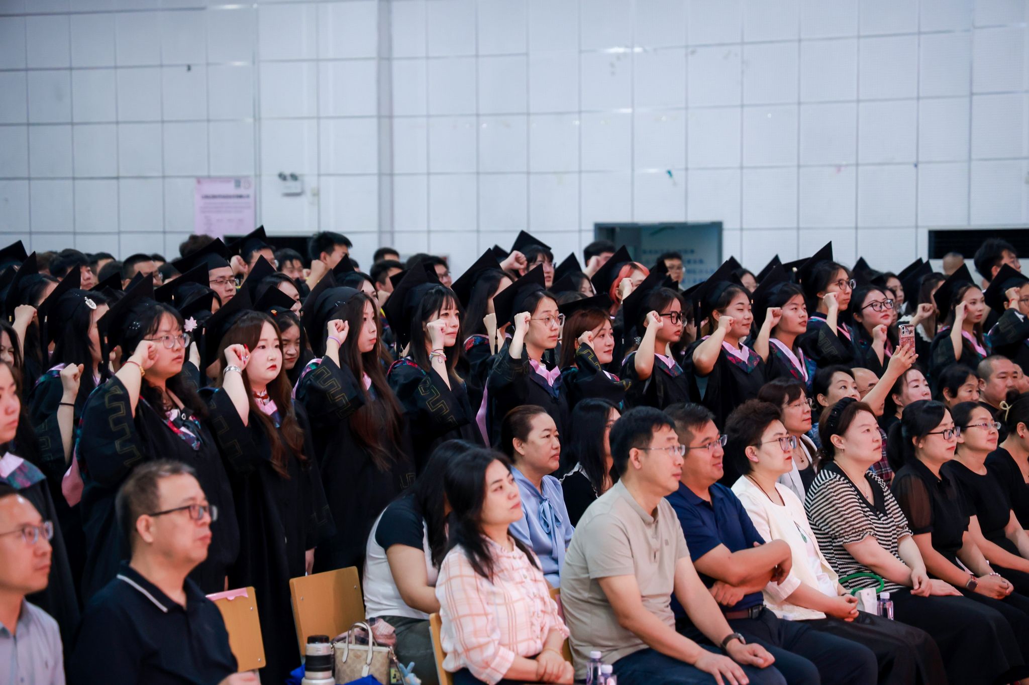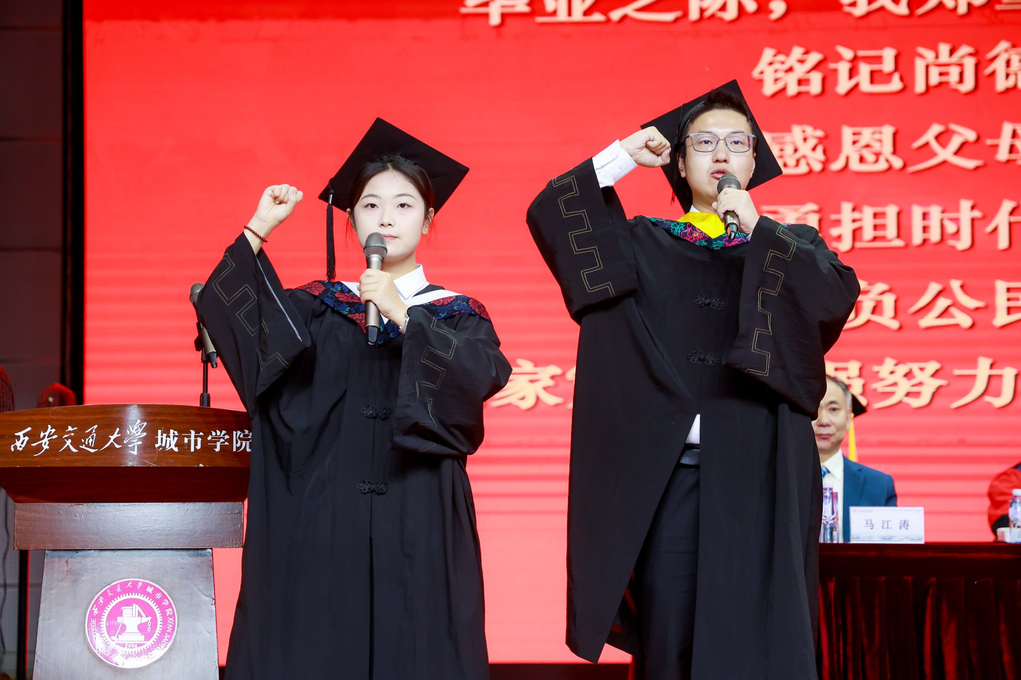 在计算机学院物联网2101班熊晨、护理与康复学院护理2102班王欣同学的带领下,全体毕业生进行宣誓。
